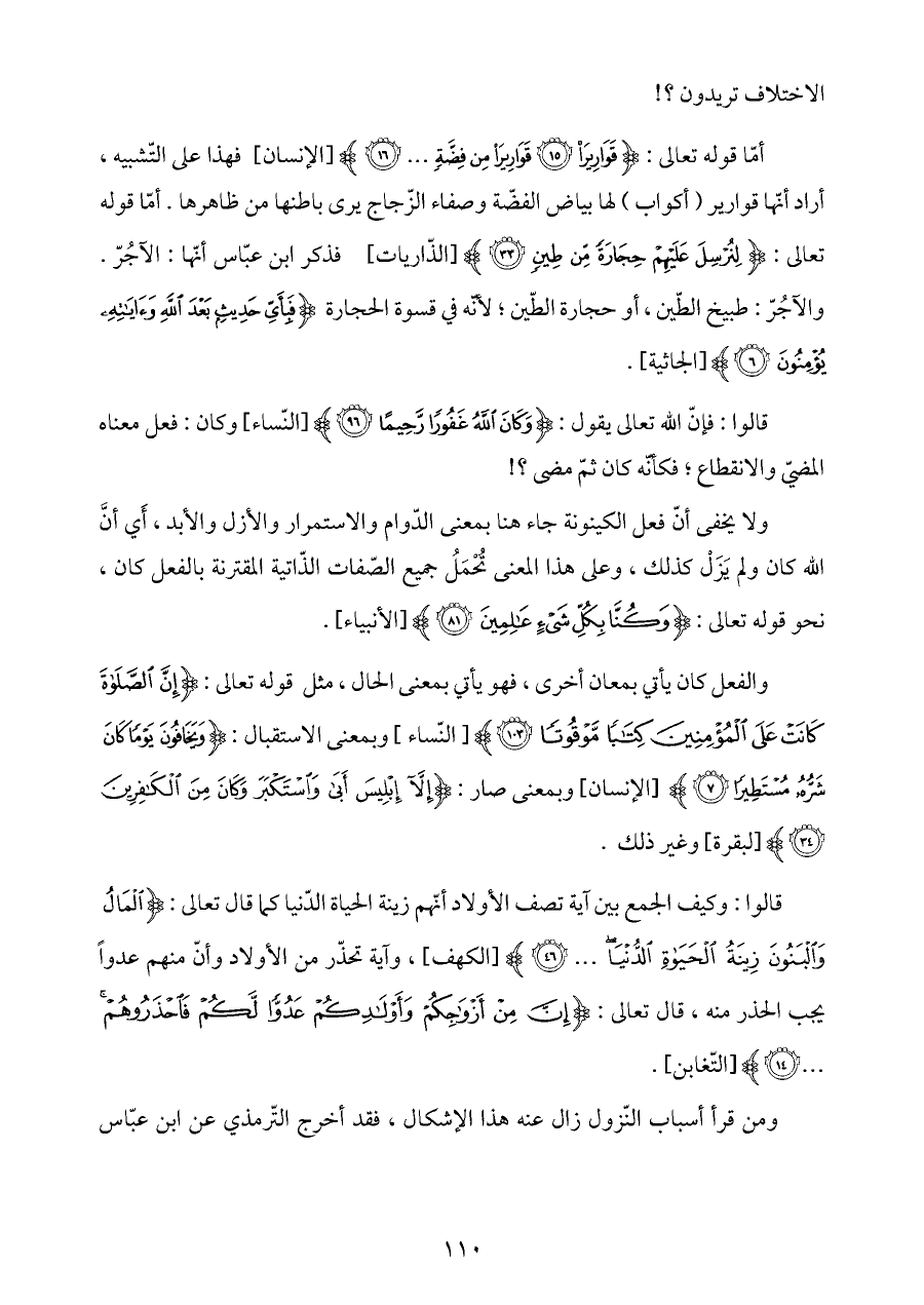 أمّا قوله تعالى: {قَوَارِيرَا (١٥) قَوَارِيرَ مِنْ فِضَّةٍ ... (١٦)} [الإنسان] فهذا على التّشبيه، أراد أنّها قوارير (أكواب) لها بياض الفضّة وصفاء الزّجاج يرى باطنها من ظاهرها. أمّا قوله تعالى: {لِنُرْسِلَ عَلَيْهِمْ حِجَارَةً مِنْ طِينٍ (٣٣)} [الذّاريات] ... فذكر ابن عبّاس أنّها: الآجُرّ. والآجُرّ: طبيخ الطّين، أو حجارة الطّين؛ لأنّه في قسوة الحجارة {فَبِأَيِّ حَدِيثٍ بَعْدَ اللَّهِ وَآيَاتِهِ يُؤْمِنُونَ (٦)} [الجاثية].