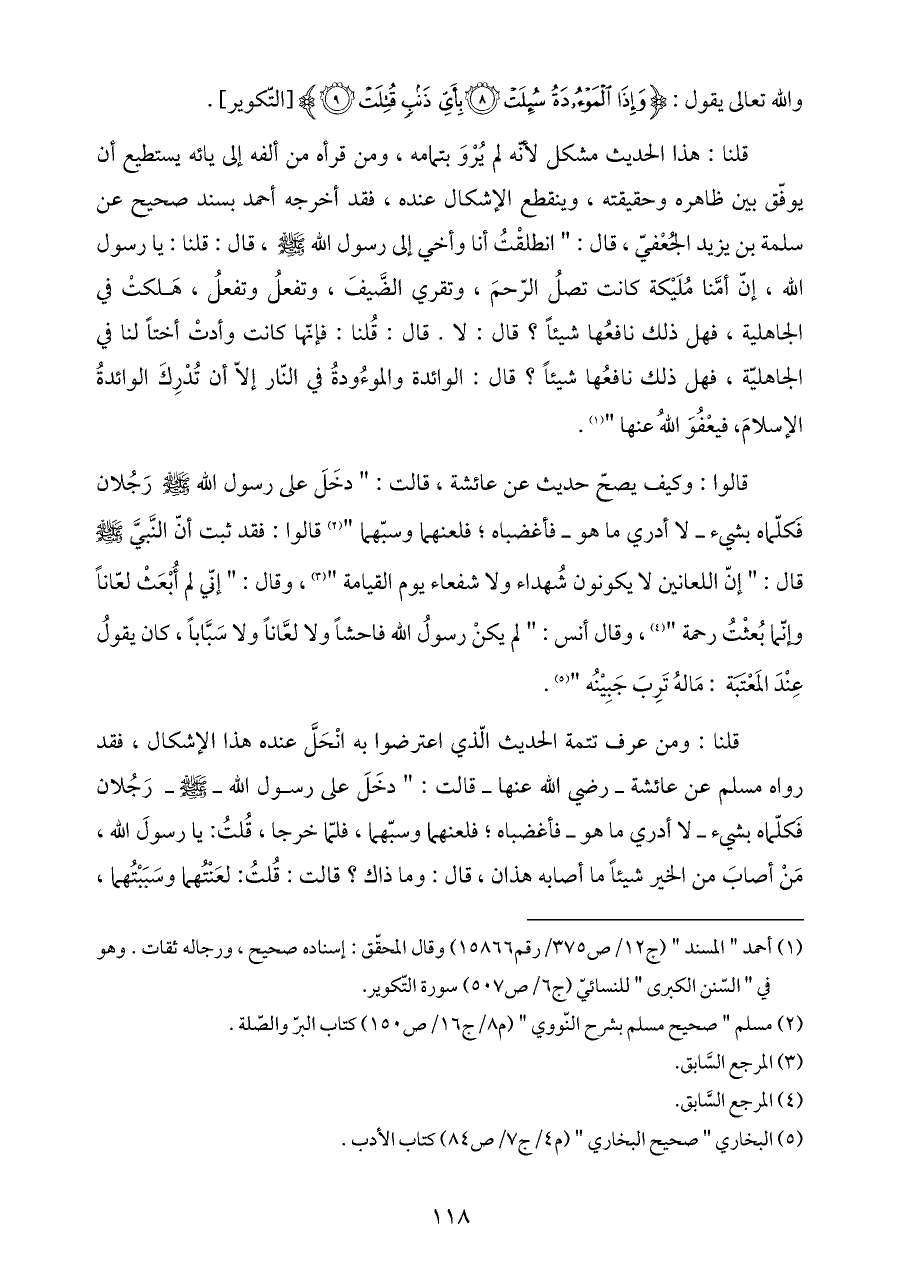 قلنا: هذا الحديث مشكل لأنّه لم يُرْوَ بتمامه، ومن قرأه من ألفه إلى يائه يستطيع أن يوفّق بين ظاهره وحقيقته، وينقطع الإشكال عنده، فقد أخرجه أحمد بسند صحيح عن سلمة بن يزيد الجُعْفيّ، قال: " انطلقْتُ أنا وأخي إلى رسول الله - صلى الله عليه وسلم -، قال: قلنا: يا رسول الله، إنّ أمَّنا مُلَيْكة كانت تصلُ الرّحمَ، وتقري الضَّيفَ، وتفعلُ وتفعلُ، هَلكتْ في الجاهلية، فهل ذلك نافعُها شيئاً؟ قال: لا. قال: قُلنا: فإنّها كانت وأدتْ أختاً لنا في الجاهليّة، فهل ذلك نافعُها شيئاً؟ قال: الوائدة والموءُودةُ في النّار إلاّ أن تُدْرِكَ الوائدةُ الإسلامَ، فيعْفُوَ اللهُ عنها " (¬١).