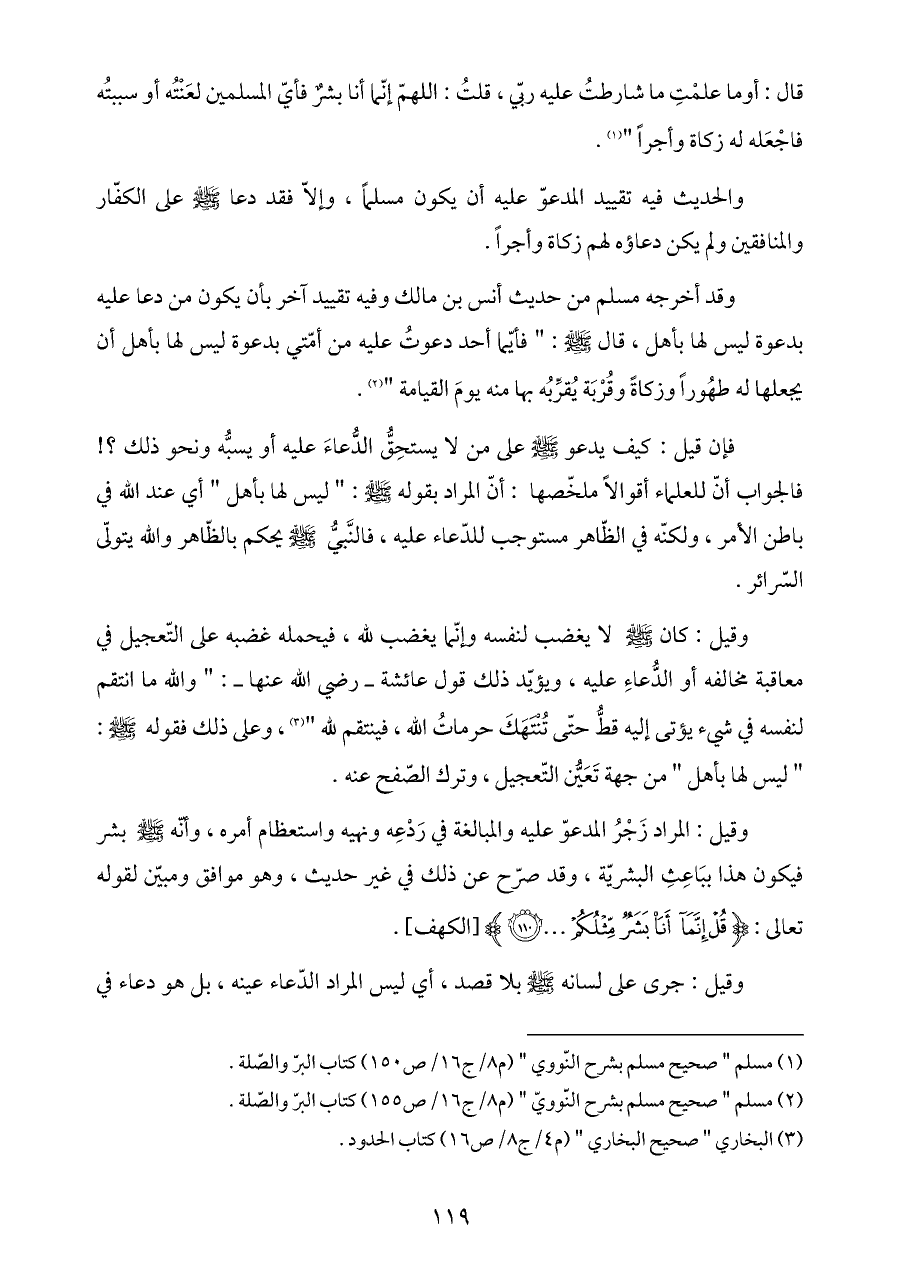 قال: أوما علمْتِ ما شارطتُ عليه ربّي، قلتُ: اللهمّ إنّما أنا بشرٌ فأيّ المسلمين لعَنْتُه أو سببتُه فاجْعَله له زكاة وأجراً " (¬١).