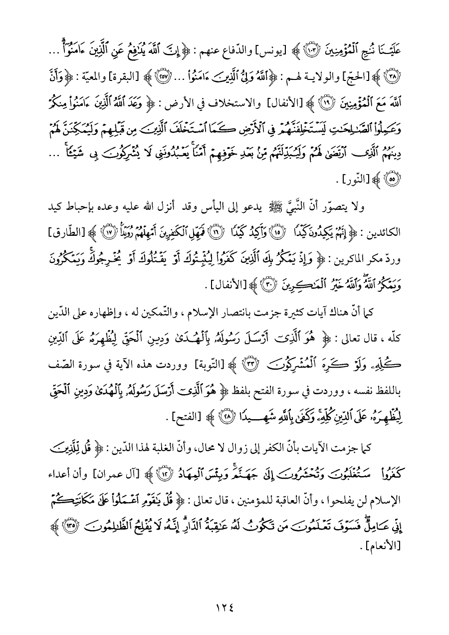 كما أنّ هناك آيات كثيرة جزمت بانتصار الإسلام، والتّمكين له، وإظهاره على الدّين كلّه، قال تعالى: {هُوَ الَّذِي أَرْسَلَ رَسُولَهُ بِالْهُدَى وَدِينِ الْحَقِّ لِيُظْهِرَهُ عَلَى الدِّينِ كُلِّهِ وَلَوْ كَرِهَ الْمُشْرِكُونَ (٣٣)} [التّوبة] ووردت هذه الآية في سورة الصّف باللفظ نفسه، ووردت في سورة الفتح بلفظ {هُوَ الَّذِي أَرْسَلَ رَسُولَهُ بِالْهُدَى وَدِينِ الْحَقِّ لِيُظْهِرَهُ عَلَى الدِّينِ كُلِّهِ وَكَفَى بِاللَّهِ شَهِيدًا (٢٨)} [الفتح].