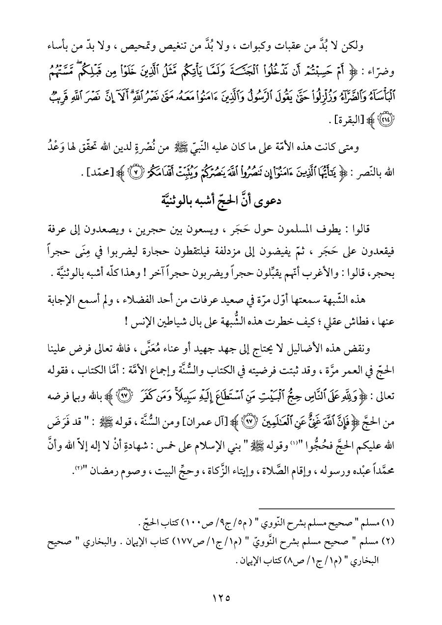 ونقض هذه الأضاليل لا يحتاج إلى جهد جهيد أو عناء مُعَنَّى، فالله تعالى فرض علينا الحجّ في العمر مرَّة، وقد ثبتت فرضيته في الكتاب والسُّنَّة وإجماع الأمَّة: أمَّا الكتاب، فقوله تعالى: {وَلِلَّهِ عَلَى النَّاسِ حِجُّ الْبَيْتِ مَنِ اسْتَطَاعَ إِلَيْهِ سَبِيلًا وَمَنْ كَفَرَ (٩٧)} بالله وبما فرضه من الحجَّ {فَإِنَّ اللَّهَ غَنِيٌّ عَنِ الْعَالَمِينَ (٩٧)} [آل عمران] ومن السُّنَّة، قوله - صلى الله عليه وسلم -: " قد فَرَضَ الله عليكم الحجَّ فحُجُّوا " (¬١) وقوله - صلى الله عليه وسلم - " بني الإسلام على خمس: شهادةِ أنْ لا إله إلاّ الله وأنَّ محمَّداً عبْده ورسوله، وإقام الصَّلاة، وإيتاء الزَّكاة، وحجِّ البيت، وصوم رمضان " (¬٢).