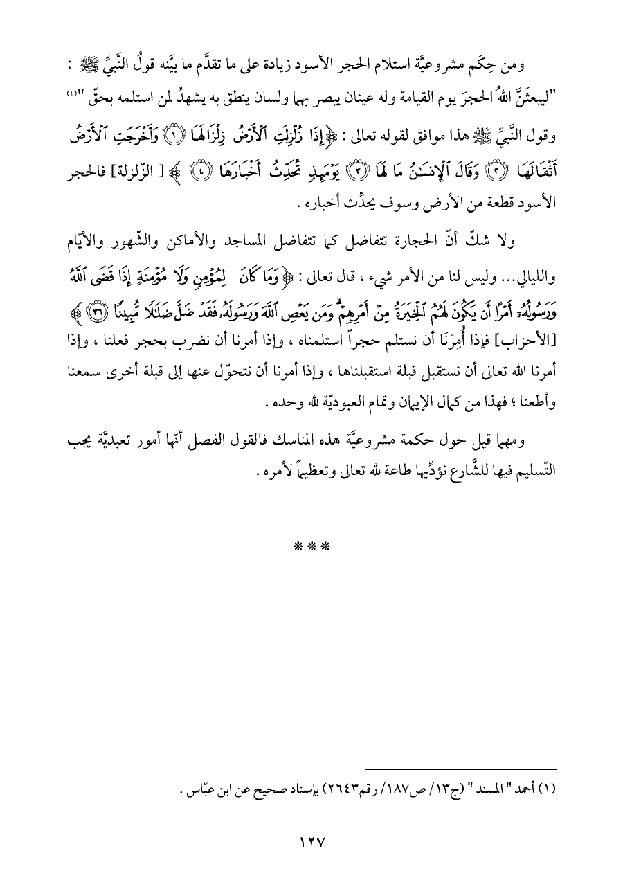 ومن حِكَم مشروعيَّة استلام الحجر الأسود زيادة على ما تقدَّم ما بيَّنه قولُ النَّبيِّ - صلى الله عليه وسلم -: "ليبعثَنَّ اللهُ الحجرَ يوم القيامة وله عينان يبصر بهما ولسان ينطق به يشهدُ لمن استلمه بحقّ " (¬١) وقول النَّبيِّ - صلى الله عليه وسلم - هذا موافق لقوله تعالى: {إِذَا زُلْزِلَتِ الْأَرْضُ زِلْزَالَهَا (١) وَأَخْرَجَتِ الْأَرْضُ أَثْقَالَهَا (٢) وَقَالَ الْإِنْسَانُ مَا لَهَا (٣) يَوْمَئِذٍ تُحَدِّثُ أَخْبَارَهَا (٤)} [الزّلزلة] فالحجر الأسود قطعة من الأرض وسوف يحدِّث أخباره.