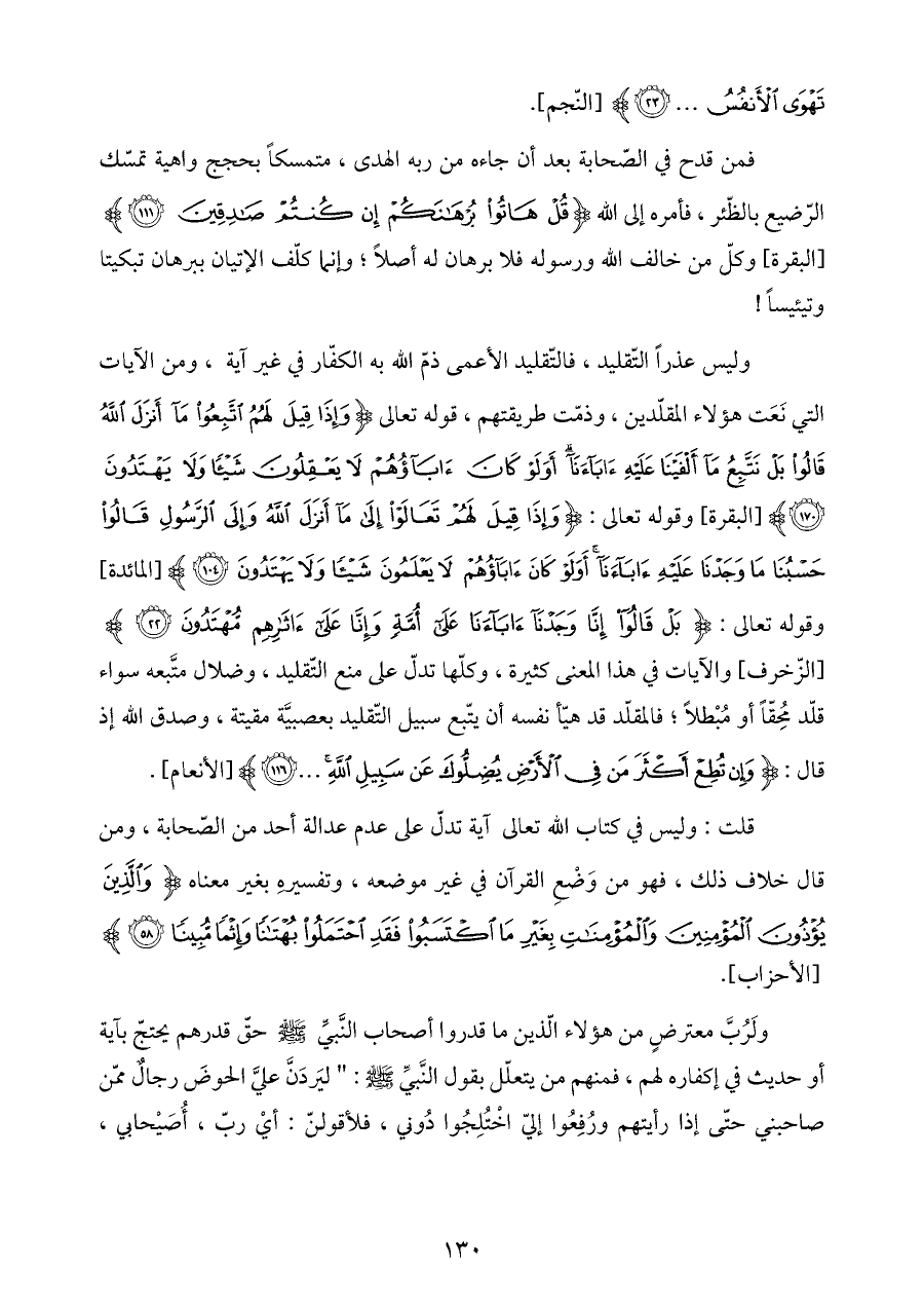وليس عذراً التّقليد، فالتّقليد الأعمى ذمّ الله به الكفّار في غير آية، ومن الآيات التي نَعَت هؤلاء المقلّدين، وذمّت طريقتهم، قوله تعالى {وَإِذَا قِيلَ لَهُمُ اتَّبِعُوا مَا أَنْزَلَ اللَّهُ قَالُوا بَلْ نَتَّبِعُ مَا أَلْفَيْنَا عَلَيْهِ آبَاءَنَا أَوَلَوْ كَانَ آبَاؤُهُمْ لَا يَعْقِلُونَ شَيْئًا وَلَا يَهْتَدُونَ (١٧٠)} [البقرة] وقوله تعالى: {وَإِذَا قِيلَ لَهُمْ تَعَالَوْا إِلَى مَا أَنْزَلَ اللَّهُ وَإِلَى الرَّسُولِ قَالُوا حَسْبُنَا مَا وَجَدْنَا عَلَيْهِ آبَاءَنَا أَوَلَوْ كَانَ آبَاؤُهُمْ لَا يَعْلَمُونَ شَيْئًا وَلَا يَهْتَدُونَ (١٠٤)} [المائدة] وقوله تعالى: {بَلْ قَالُوا إِنَّا وَجَدْنَا آبَاءَنَا عَلَى أُمَّةٍ وَإِنَّا عَلَى آثَارِهِمْ مُهْتَدُونَ (٢٢)} [الزّخرف] والآيات في هذا المعنى كثيرة، وكلّها تدلّ على منع التّقليد، وضلال متَّبعه سواء قلّد مُحِقّاً أو مُبْطلاً؛ فالمقلّد قد هيّأ نفسه أن يتّبع سبيل التّقليد بعصبيَّة مقيتة، وصدق الله إذ قال: {وَإِنْ تُطِعْ أَكْثَرَ مَنْ فِي الْأَرْضِ يُضِلُّوكَ عَنْ سَبِيلِ اللَّهِ ... (١١٦)} [الأنعام].