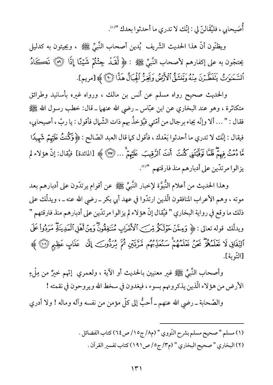والحديث صحيح رواه مسلم عن أنس بن مالك، ورواه غيره بأسانيد وطرائق متكاثرة، وهو عند البخاري عن ابن عبّاس ـ رضي الله عنهما ـ قال: خطب رسول الله - صلى الله عليه وسلم - فقال: " ... ألا وإنّه يجاء برجال من أمّتي فيُؤخذُ بهم ذات الشّمال فأقول: يا ربّ، أصيحابي، فيقال: إنّك لا تدري ما أحدثوا بَعْدك، فأقول كما قال العبد الصّالح: {وَكُنْتُ عَلَيْهِمْ شَهِيدًا مَا دُمْتُ فِيهِمْ فَلَمَّا تَوَفَّيْتَنِي كُنْتَ أَنْتَ الرَّقِيبَ عَلَيْهِمْ ... (١١٧)} [المائدة] فيُقال: إنّ هؤلاء لم يزالوا مرتدّين على أدبارهم منذ فارقتهم " (¬٢).
