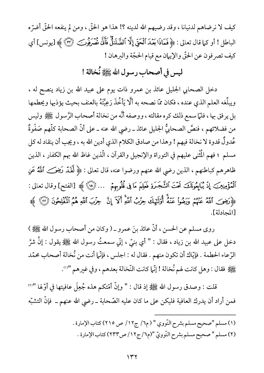 دخل الصحابي الجليل عائذ بن عمرو ذات يوم على عبيد الله بن زياد ينصح له، ويبلِّغه العلم الذي عنده، فكان ممّا نصحه به ألَّا يَأخُذَ رَعِيَّتَهُ بالعنف بحيث يؤذيها ويحطمها بل يرفق بها، فلمّا سمع ذلك كره مقالته، ووصفه أنَّه من نخالة أصحاب الرَّسول - صلى الله عليه وسلم - وليس من فضلائهم، فنصَّ الصحابيُّ الجليل عائذ ـ رضي الله عنه ـ على أنّ الصحابة كلّهم صَفْوةٌ عُدولٌ قدوة لا نخالة فيهم! وهذا من صادق الكلام الذي أدين الله به، ويجب أن ينقاد له كل مسلم؛ فهم المُثْنى عليهم في التوراة والإنجيل والقرآن، الّذين غاظ الله بهم الكفار، الذين ظاهرهم كباطنهم، الذين رضي الله عنهم ورضوا عنه، قال تعالى: {لَقَدْ رَضِيَ اللَّهُ عَنِ الْمُؤْمِنِينَ إِذْ يُبَايِعُونَكَ تَحْتَ الشَّجَرَةِ فَعَلِمَ مَا فِي قُلُوبِهِمْ ... (١٨)} [الفتح] وقال تعالى: {رَضِيَ اللَّهُ عَنْهُمْ وَرَضُوا عَنْهُ أُولَئِكَ حِزْبُ اللَّهِ أَلَا إِنَّ حِزْبَ اللَّهِ هُمُ الْمُفْلِحُونَ (٢٢)} [المجادلة].