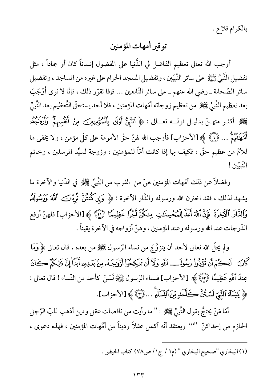 أوجب الله تعالى تعظيم الفاضل في الدُّنيا على المفضول إنساناً كان أو جماداً، مثل تفضيل النَّبيِّ - صلى الله عليه وسلم - على سائر النّبيّين، وتفضيل المسجد الحرام على غيره من المساجد، وتفضيل سائر الصّحابة ـ رضي الله عنهم ـ على سائر التّابعين ... فإذا تقرّر ذلك، فإنّا لا نرى أَوْجَبَ بعد تعظيم النَّبيِّ - صلى الله عليه وسلم - من تعظيم زوجاته أمّهات المؤمنين، فلا أحد يستحقّ التَّعظيم بعد النَّبيِّ - صلى الله عليه وسلم - أكثر منهنّ بدليل قوله تعالى: {النَّبِيُّ أَوْلَى بِالْمُؤْمِنِينَ مِنْ أَنْفُسِهِمْ وَأَزْوَاجُهُ أُمَّهَاتُهُمْ ... (٦)} [الأحزاب] فأوجب الله لهنّ حقّ الأمومة على كلّ مؤمن، ولا يخفى ما للأمِّ من عظيم حقّ، فكيف بها إذا كانت أمّاً للمؤمنين، وزوجة لسيِّد المرسلين، وخاتم النّبيّين!