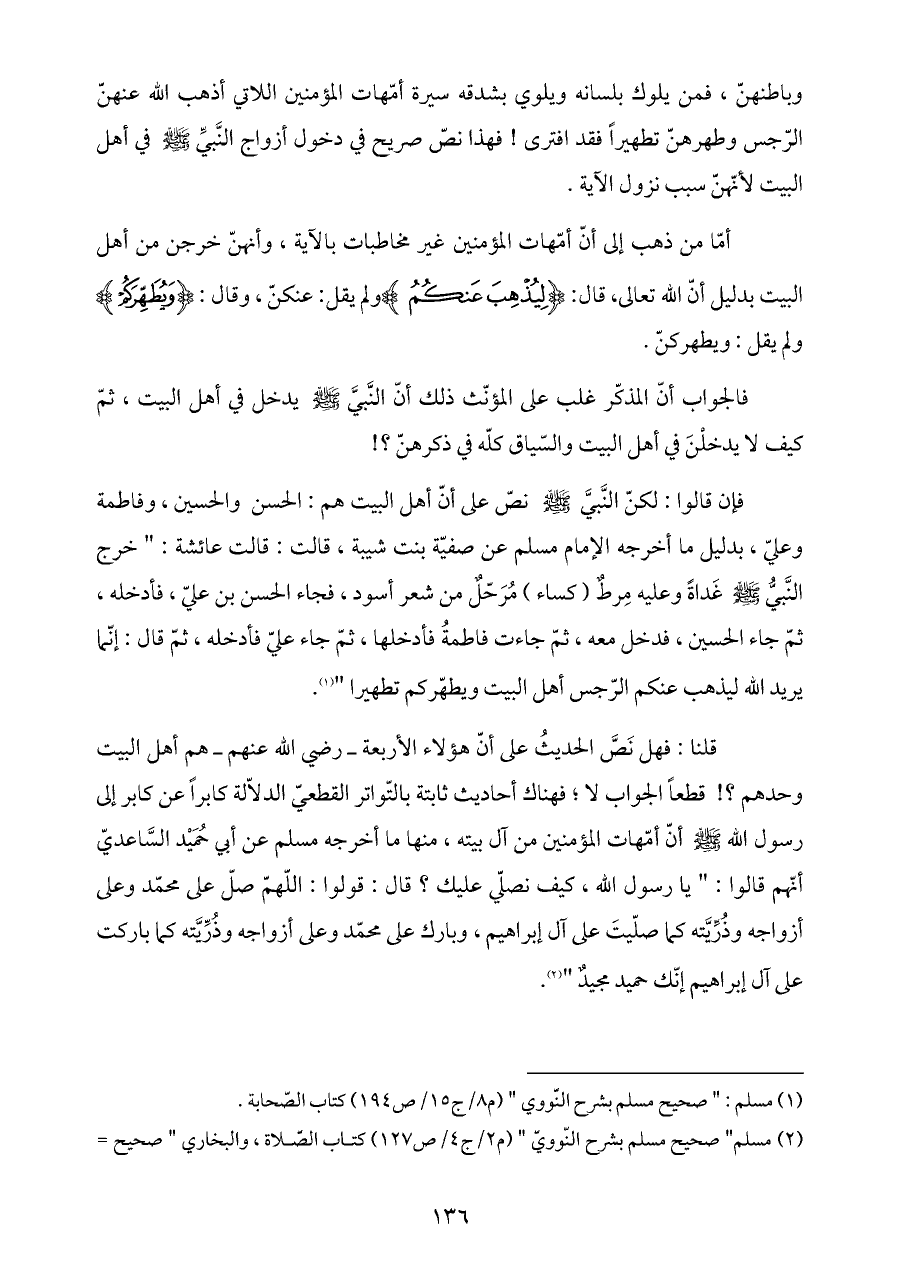 فإن قالوا: لكنّ النَّبيَّ - صلى الله عليه وسلم - نصّ على أنّ أهل البيت هم: الحسن والحسين، وفاطمة وعليّ، بدليل ما أخرجه الإمام مسلم عن صفيّة بنت شيبة، قالت: قالت عائشة: " خرج النَّبيُّ - صلى الله عليه وسلم - غَداةً وعليه مِرطٌ (كساء) مُرَحّلٌ من شعر أسود، فجاء الحسن بن عليّ، فأدخله، ثمّ جاء الحسين، فدخل معه، ثمّ جاءت فاطمةُ فأدخلها، ثمّ جاء عليّ فأدخله، ثمّ قال: إنّما يريد الله ليذهب عنكم الرّجس أهل البيت ويطهّركم تطهيرا " (¬١).