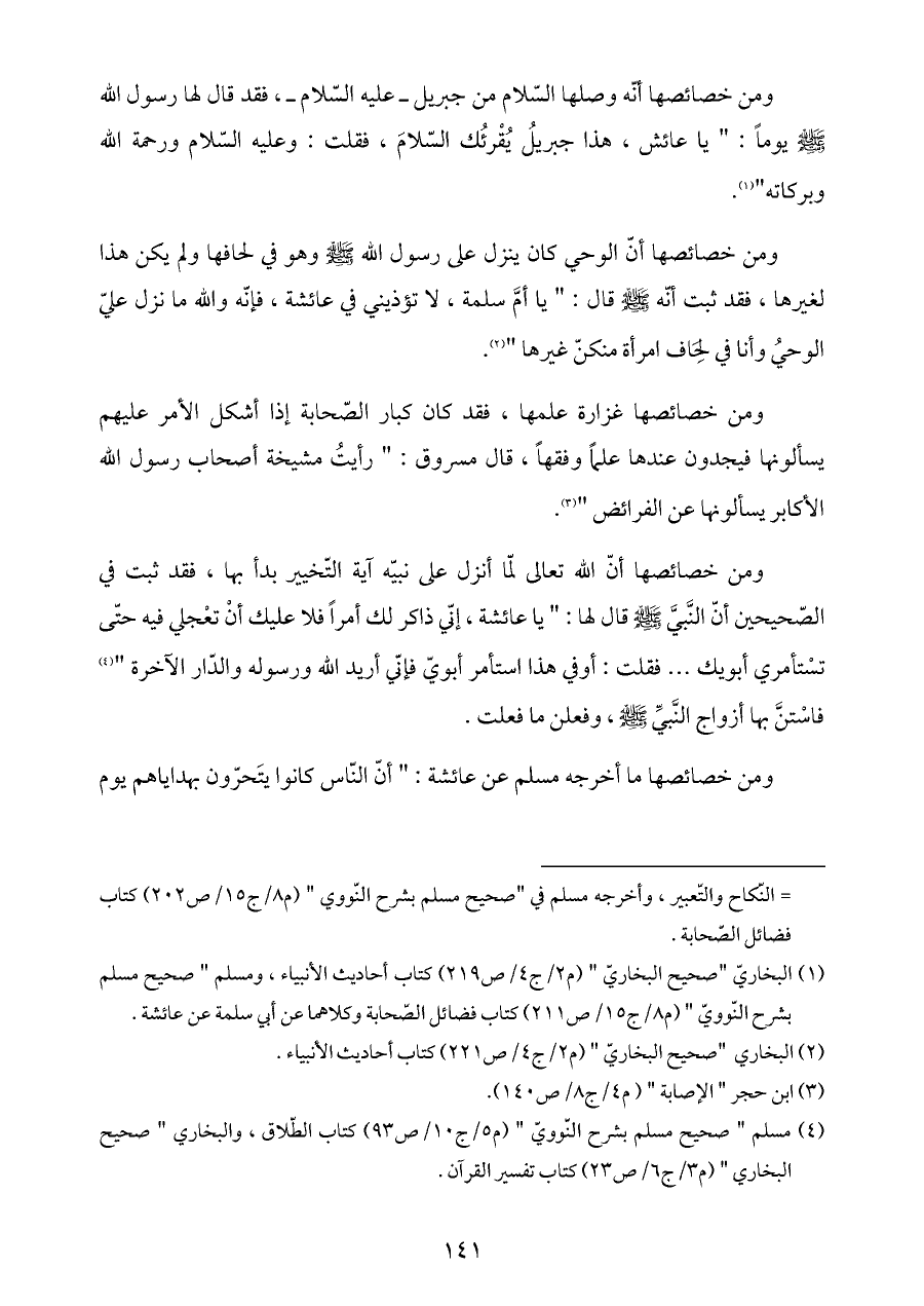 ومن خصائصها أنّ الوحي كان ينزل على رسول الله - صلى الله عليه وسلم - وهو في لحافها ولم يكن هذا لغيرها، فقد ثبت أنّه - صلى الله عليه وسلم - قال: " يا أمَّ سلمة، لا تؤذيني في عائشة، فإنّه والله ما نزل عليّ الوحيُ وأنا في لِحَاف امرأة منكنّ غيرها " (¬٢).