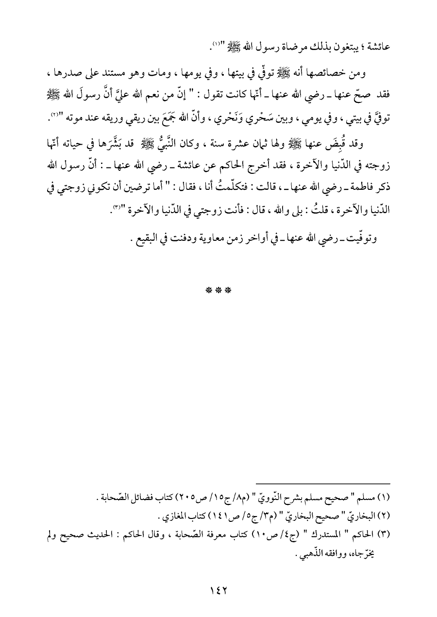 ومن خصائصها أنه - صلى الله عليه وسلم - توفّي في بيتها، وفي يومها، ومات وهو مستند على صدرها، فقد صحّ عنها ـ رضي الله عنها ـ أنّها كانت تقول: " إنّ من نعم الله عليَّ أنَّ رسولَ الله - صلى الله عليه وسلم - توفيَّ في بيتي، وفي يومي، وبين سَحْري وَنَحْري، وأنّ الله جَمَعَ بين ريقي وريقه عند موته " (¬٢).