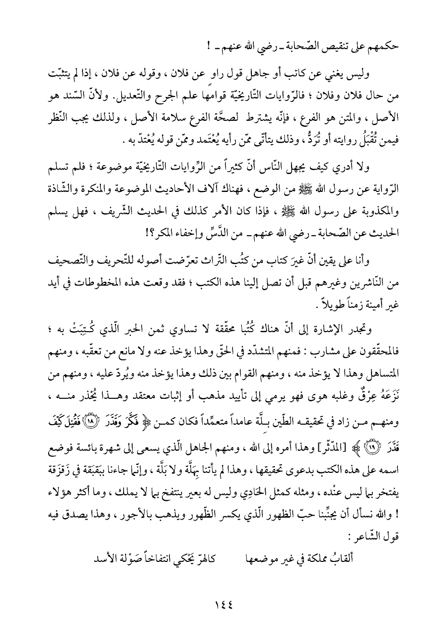 وتجدر الإشارة إلى أنّ هناك كُتُبا محقّقة لا تساوي ثمن الحبر الّذي كُتِبَتْ به؛ فالمحقّقون على مشارب: فمنهم المتشدّد في الحقّ وهذا يؤخذ عنه ولا مانع من تعقّبه، ومنهم المتساهل وهذا لا يؤخذ منه، ومنهم القوام بين ذلك وهذا يؤخذ منه ويُردّ عليه، ومنهم من نَزَعَهُ عِرْقٌ وغلبه هوى فهو يرمي إلى تأييد مذهب أو إثبات معتقد وهذا يُحْذر منه، ومنهم من زاد في تحقيقه الطّين بِلَّة عامداً متعمِّداً فكان كمن {فَكَّرَ وَقَدَّرَ (١٨) فَقُتِلَ كَيْفَ قَدَّرَ (١٩)} [المدّثّر] وهذا أمره إلى الله، ومنهم الجاهل الّذي يسعى إلى شهرة بائسة فوضع اسمه على هذه الكتب بدعوى تحقيقها، وهذا لم يأتنا بِهَلَّة ولا بَلَّة، وإنّما جاءنا ببَقبَقة في زَقزَقة يفتخر بما ليس عنْده، ومثله كمثل الحَادِي وليس له بعير ينتفخ بما لا يملك، وما أكثر هؤلاء! والله نسأل أن يجنِّبنا حبّ الظهور الّذي يكسر الظّهور ويذهب بالأجور، وهذا يصدق فيه قول الشّاعر: