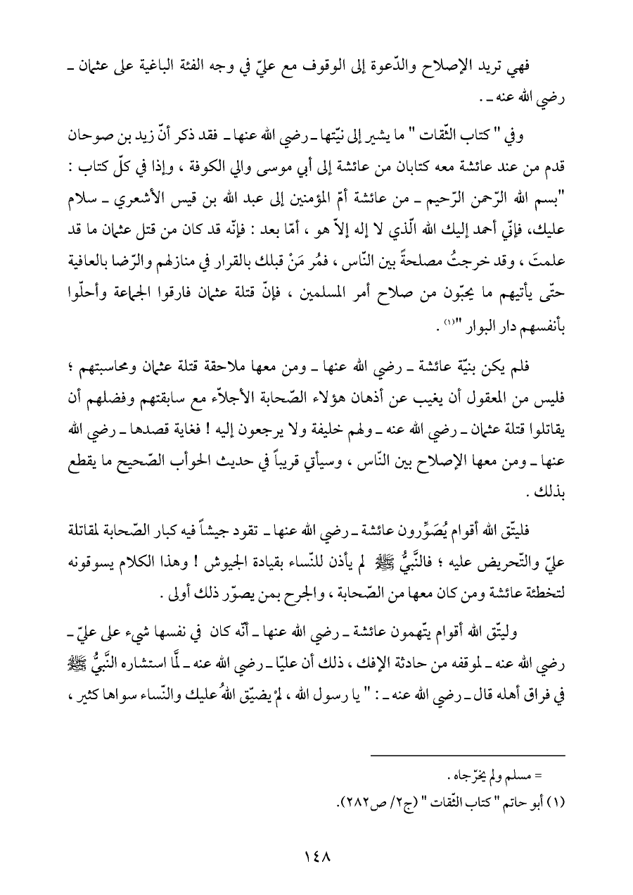 وفي " كتاب الثّقات " ما يشير إلى نيّتها ـ رضي الله عنها ـ فقد ذكر أنّ زيد بن صوحان قدم من عند عائشة معه كتابان من عائشة إلى أبي موسى والي الكوفة، وإذا في كلّ كتاب: "بسم الله الرّحمن الرّحيم ـ من عائشة أمّ المؤمنين إلى عبد الله بن قيس الأشعري ـ سلام عليك، فإنّي أحمد إليك الله الّذي لا إله إلاّ هو، أمّا بعد: فإنّه قد كان من قتل عثمان ما قد علمتَ، وقد خرجتُ مصلحةً بين النّاس، فمُر مَنْ قبلك بالقرار في منازلهم والرّضا بالعافية حتّى يأتيهم ما يحبّون من صلاح أمر المسلمين، فإنّ قتلة عثمان فارقوا الجماعة وأحلّوا بأنفسهم دار البوار " (¬١).