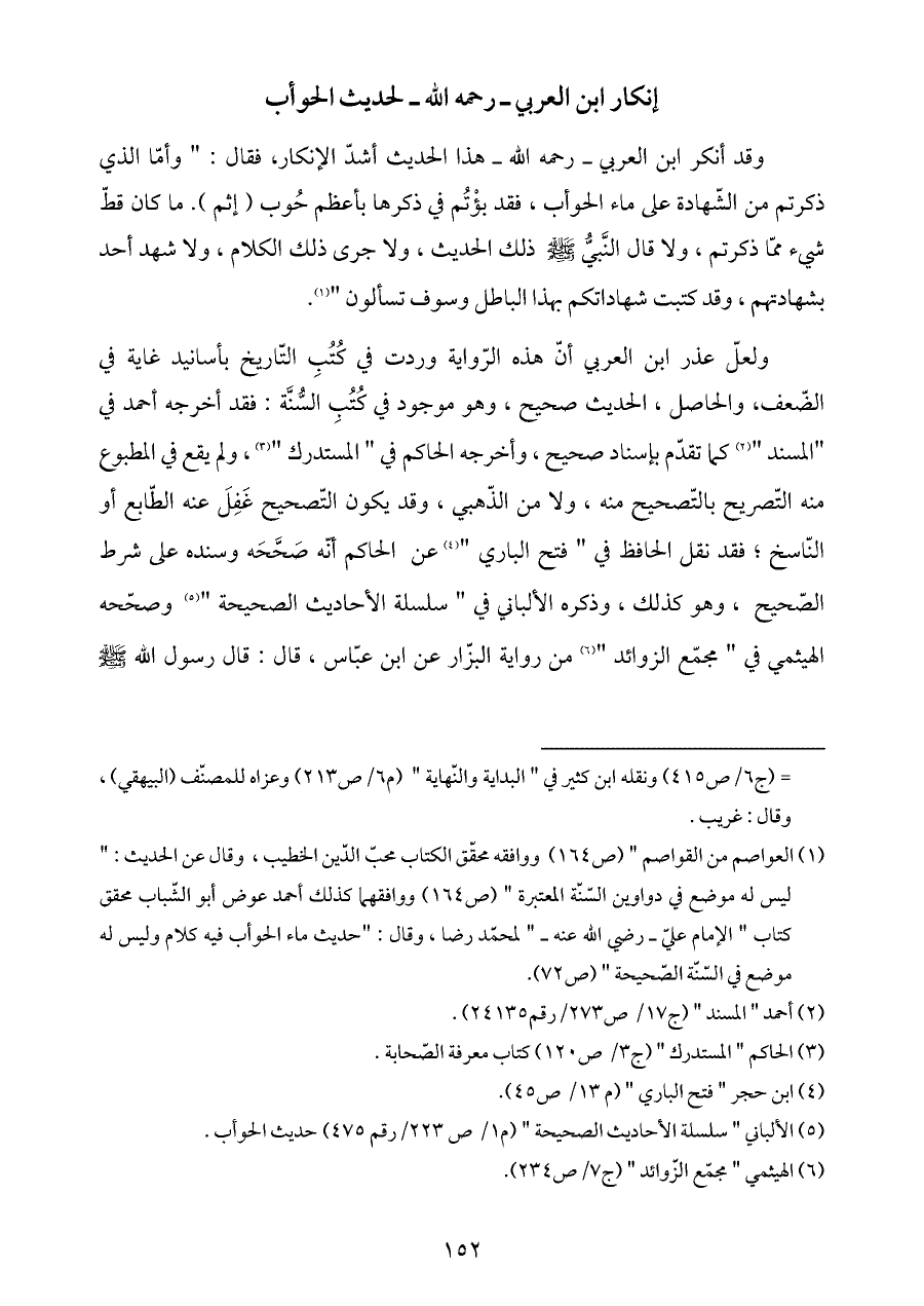 (¬١) العواصم من القواصم " (ص ١٦٤) ووافقه محقّق الكتاب محبّ الدّين الخطيب، وقال عن الحديث: " ليس له موضع في دواوين السّنّة المعتبرة " (ص ١٦٤) ووافقهما كذلك أحمد عوض أبو الشّباب محقق كتاب " الإمام عليّ ـ رضي الله عنه ـ " لمحمّد رضا، وقال: "حديث ماء الحوأب فيه كلام وليس له موضع في السّنّة الصّحيحة " (ص ٧٢).
