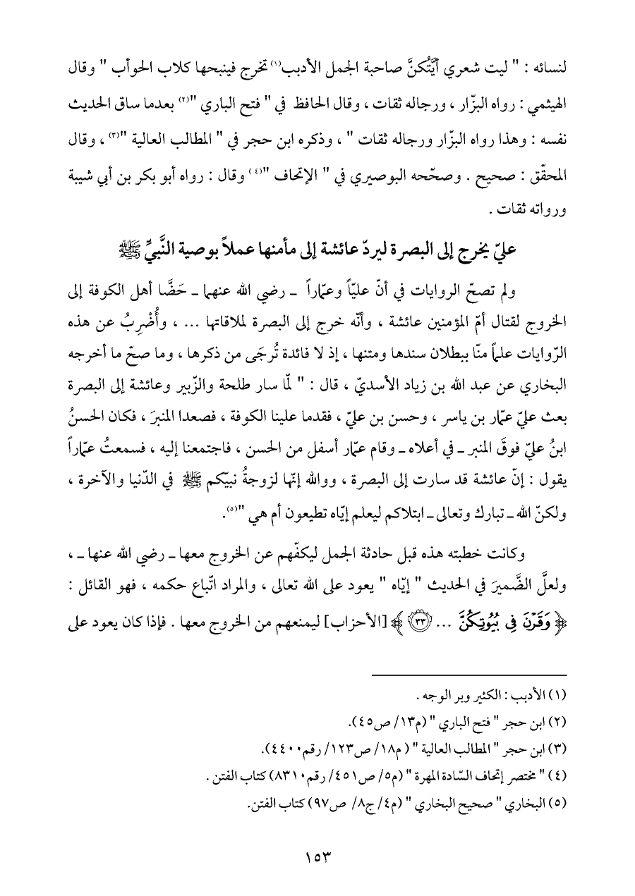 ولم تصحّ الروايات في أنّ عليّاً وعمّاراً ـ رضي الله عنهما ـ حَضَّا أهل الكوفة إلى الخروج لقتال أمّ المؤمنين عائشة، وأنّه خرج إلى البصرة لملاقاتها ... ، وأُضْرِبُ عن هذه الرّوايات علماً منّا ببطلان سندها ومتنها، إذ لا فائدة تُرجَى من ذكرها، وما صحّ ما أخرجه البخاري عن عبد الله بن زياد الأسديّ، قال: " لمّا سار طلحة والزّبير وعائشة إلى البصرة بعث عليّ عمّار بن ياسر، وحسن بن عليّ، فقدما علينا الكوفة، فصعدا المنبرَ، فكان الحسنُ ابنُ عليّ فوقَ المنبر ـ في أعلاه ـ وقام عمّار أسفل من الحسن، فاجتمعنا إليه، فسمعتُ عمّاراً يقول: إنّ عائشة قد سارت إلى البصرة، ووالله إنّها لزوجةُ نبيّكم - صلى الله عليه وسلم - في الدّنيا والآخرة، ولكنّ الله ـ تبارك وتعالى ـ ابتلاكم ليعلم إيّاه تطيعون أم هي " (¬٥).