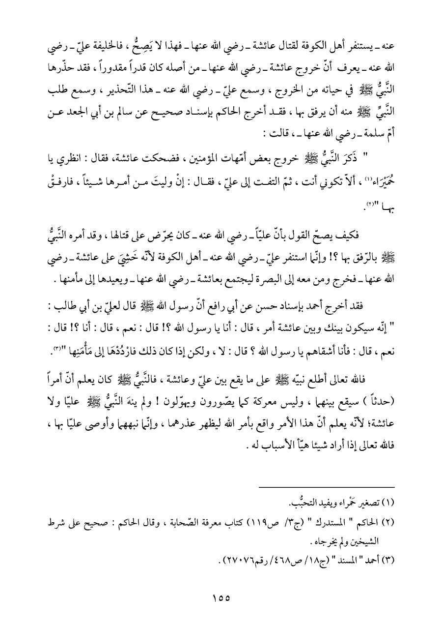 عنه ـ يستنفر أهل الكوفة لقتال عائشة ـ رضي الله عنها ـ فهذا لا يَصِحُّ، فالخليفة عليّ ـ رضي الله عنه ـ يعرف أنّ خروج عائشة ـ رضي الله عنها ـ من أصله كان قدراً مقدوراً، فقد حذّرها النَّبيُّ - صلى الله عليه وسلم - في حياته من الخروج، وسمع عليّ ـ رضي الله عنه ـ هذا التّحذير، وسمع طلب النَّبيِّ - صلى الله عليه وسلم - منه أن يرفق بها، فقد أخرج الحاكم بإسناد صحيح عن سالم بن أبي الجعد عن أمّ سلمة ـ رضي الله عنها ـ، قالت: