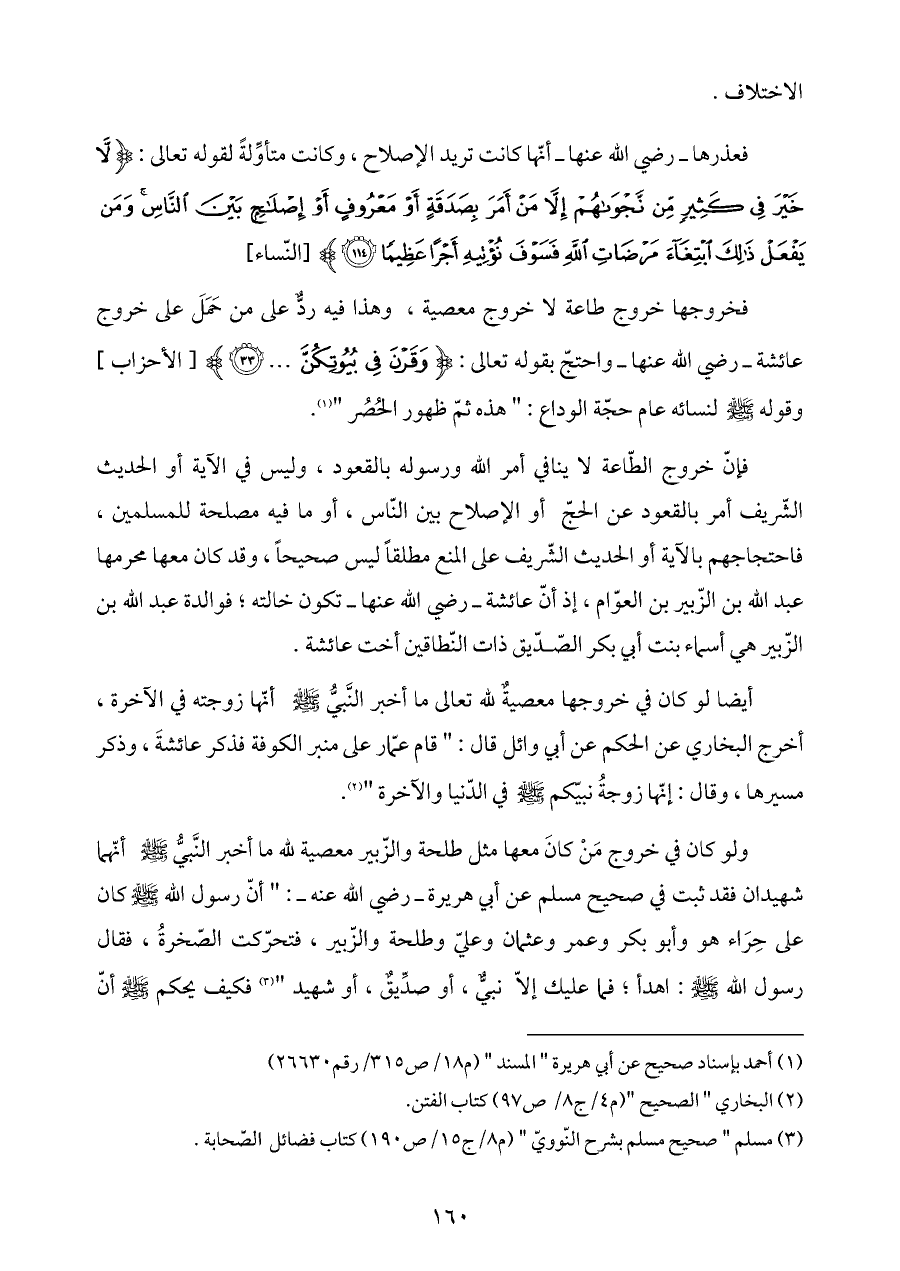 ولو كان في خروج مَنْ كانَ معها مثل طلحة والزّبير معصية لله ما أخبر النَّبيُّ - صلى الله عليه وسلم - أنّهما شهيدان فقد ثبت في صحيح مسلم عن أبي هريرة ـ رضي الله عنه ـ: " أنّ رسول الله - صلى الله عليه وسلم - كان على حِرَاء هو وأبو بكر وعمر وعثمان وعليّ وطلحة والزّبير، فتحرّكت الصّخرةُ، فقال رسول الله - صلى الله عليه وسلم -: اهدأ؛ فما عليك إلاّ نبيٌّ، أو صدِّيقٌ، أو شهيد " (¬٣) فكيف يحكم - صلى الله عليه وسلم - أنّ