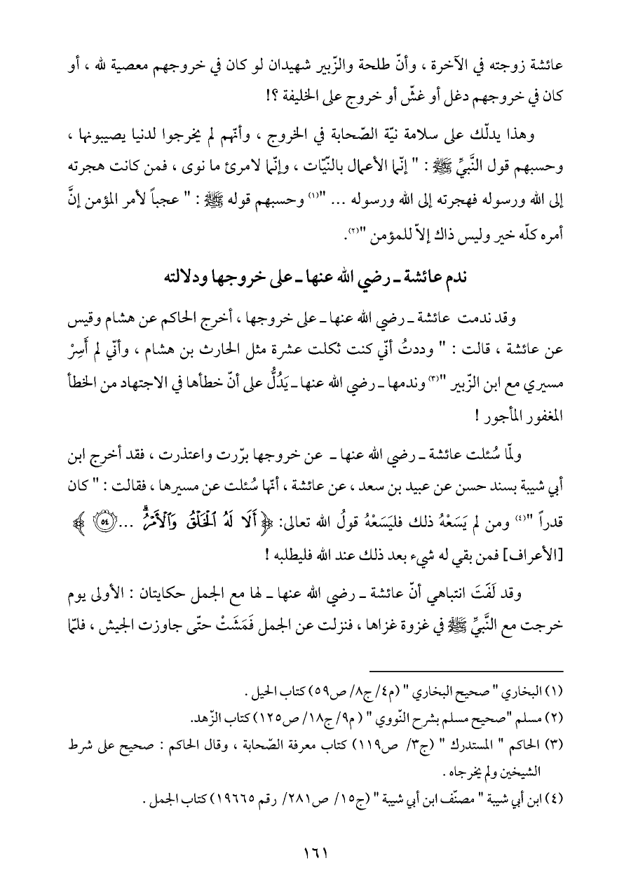 ولمّا سُئلت عائشة ـ رضي الله عنها ـ عن خروجها برّرت واعتذرت، فقد أخرج ابن أبي شيبة بسند حسن عن عبيد بن سعد، عن عائشة، أنّها سُئلت عن مسيرها، فقالت: " كان قدراً " (¬٤) ومن لم يَسَعْهُ ذلك فليَسَعْهُ قولُ الله تعالى: {أَلَا لَهُ الْخَلْقُ وَالْأَمْرُ ... (٥٤)} [الأعراف] فمن بقي له شيء بعد ذلك عند الله فليطلبه!