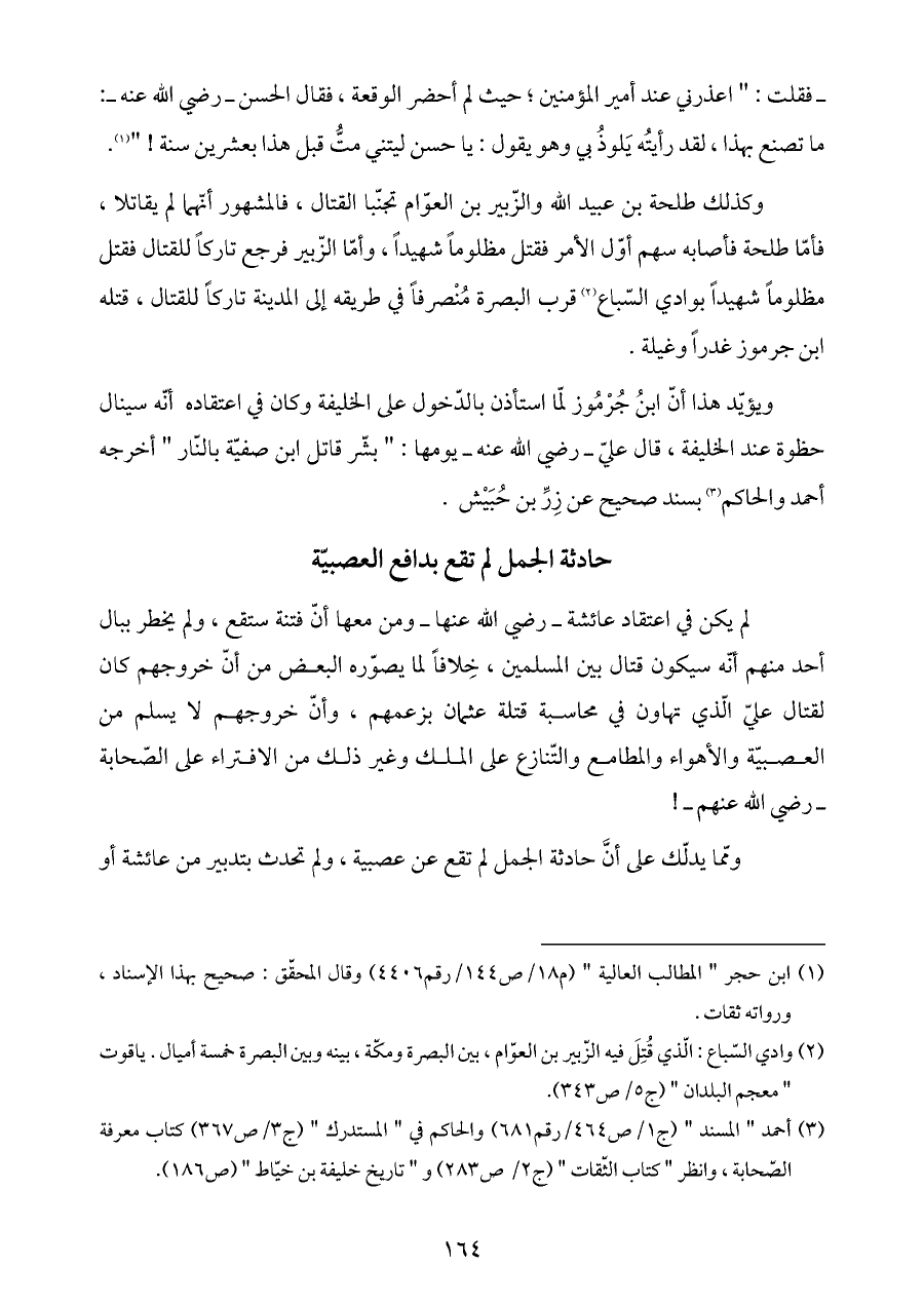وكذلك طلحة بن عبيد الله والزّبير بن العوّام تجنّبا القتال، فالمشهور أنّهما لم يقاتلا، فأمّا طلحة فأصابه سهم أوّل الأمر فقتل مظلوماً شهيداً، وأمّا الزّبير فرجع تاركاً للقتال فقتل مظلوماً شهيداً بوادي السّباع (¬٢) قرب البصرة مُنْصرفاً في طريقه إلى المدينة تاركاً للقتال، قتله ابن جرموز غدراً وغيلة.