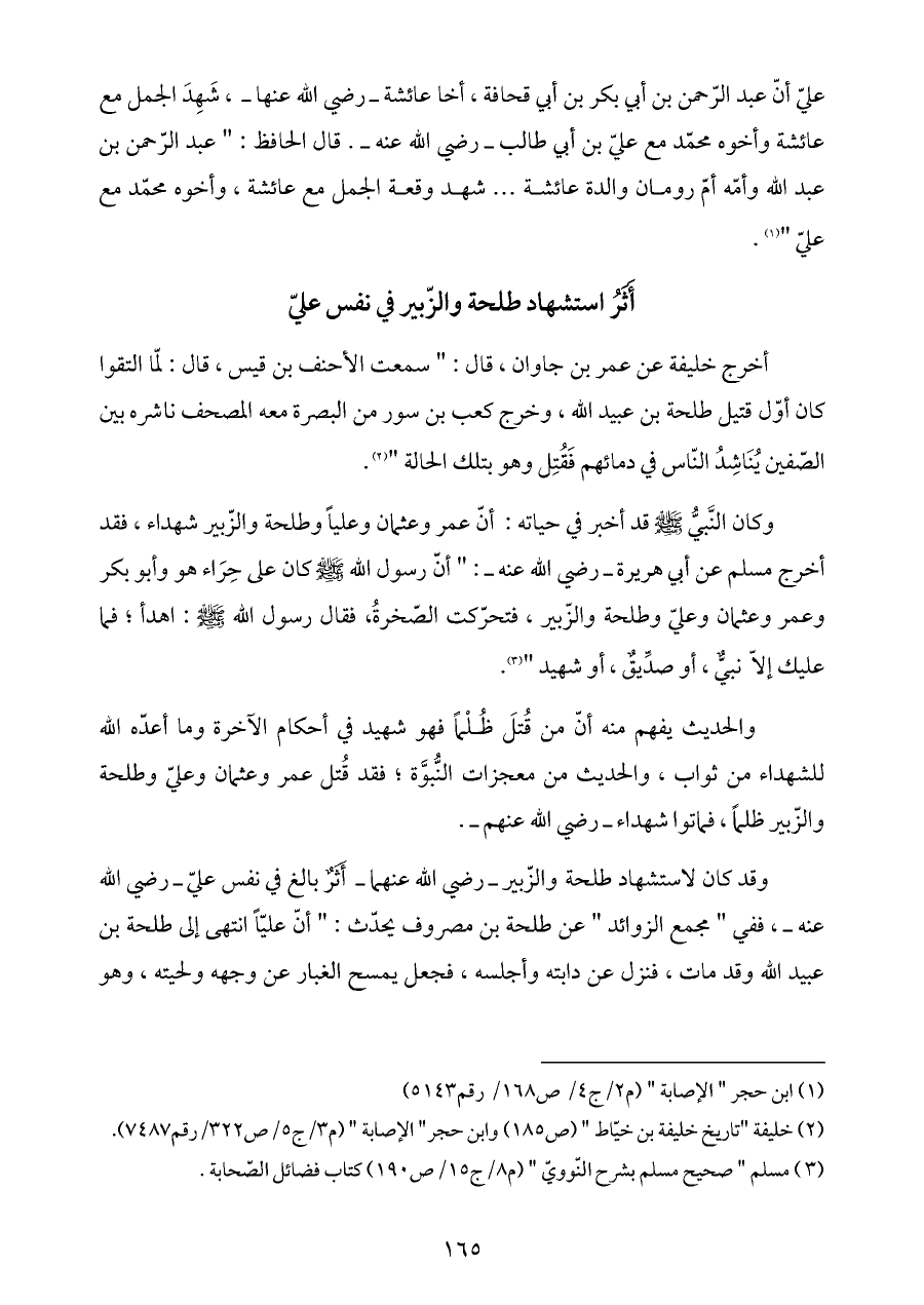 أَثَرُ استشهاد طلحة والزّبير في نفس عليّ