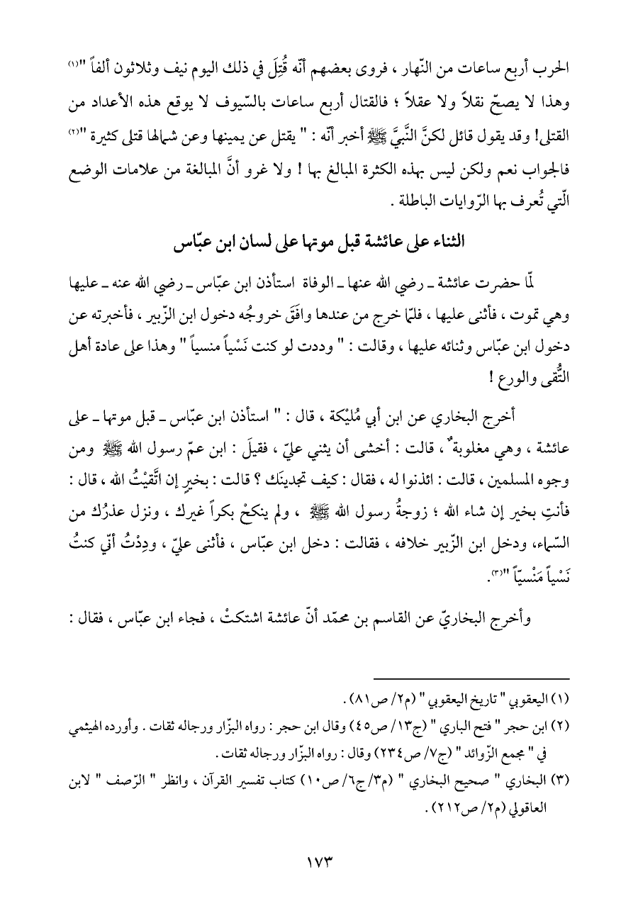 الحرب أربع ساعات من النّهار، فروى بعضهم أنّه قُتِلَ في ذلك اليوم نيف وثلاثون ألفاً " (¬١) وهذا لا يصحّ نقلاً ولا عقلاً؛ فالقتال أربع ساعات بالسّيوف لا يوقع هذه الأعداد من القتلى! وقد يقول قائل لكنَّ النَّبيَّ - صلى الله عليه وسلم - أخبر أنّه: " يقتل عن يمينها وعن شمالها قتلى كثيرة " (¬٢) فالجواب نعم ولكن ليس بهذه الكثرة المبالغ بها! ولا غرو أنَّ المبالغة من علامات الوضع الّتي تُعرف بها الرّوايات الباطلة.