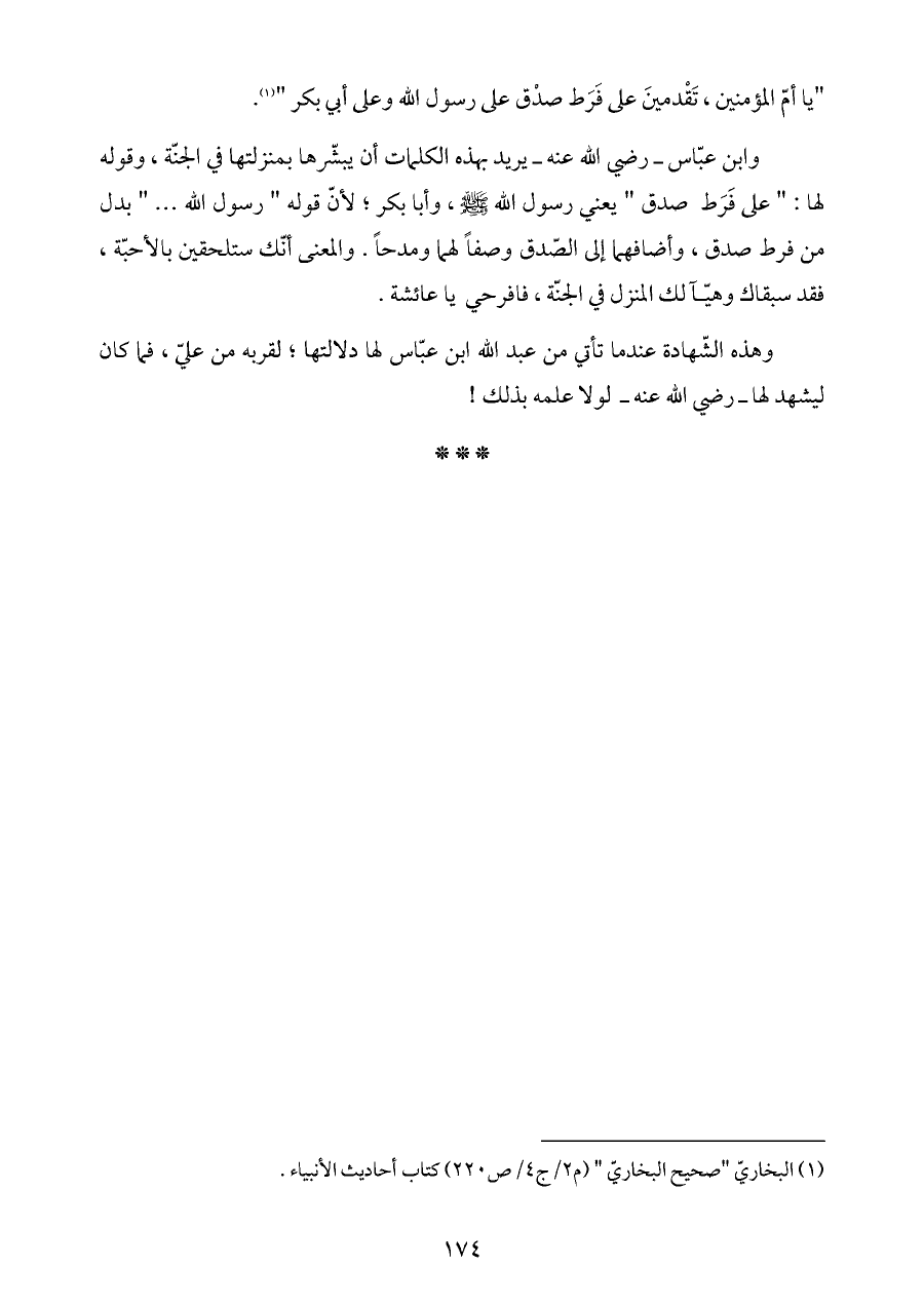 وابن عبّاس ـ رضي الله عنه ـ يريد بهذه الكلمات أن يبشّرها بمنزلتها في الجنّة، وقوله لها: " على فَرَط صدق " يعني رسول الله - صلى الله عليه وسلم -، وأبا بكر؛ لأنّ قوله " رسول الله ... " بدل من فرط صدق، وأضافهما إلى الصّدق وصفاً لهما ومدحاً. والمعنى أنّك ستلحقين بالأحبّة، فقد سبقاك وهيّآ لك المنزل في الجنّة، فافرحي يا عائشة.