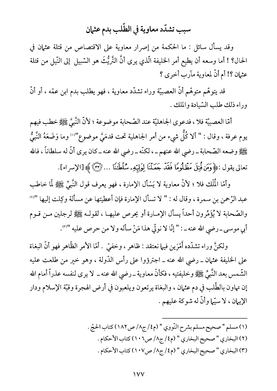 قد يتوهّم متوهّم أنّ العصبيّة وراء تشدّد معاوية، فهو يطلب بدم ابن عمّه، أو أنّ وراء ذلك طلب السّيادة والملك.