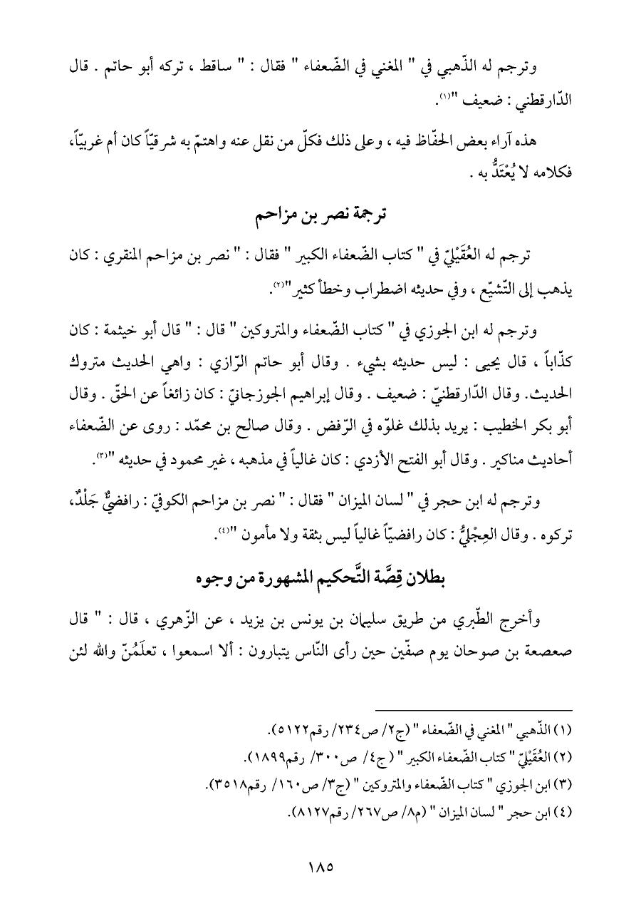 وترجم له ابن حجر في " لسان الميزان " فقال: " نصر بن مزاحم الكوفيّ: رافضيٌّ جَلْدٌ، تركوه. وقال العِجْليُّ: كان رافضيّاً غالياً ليس بثقة ولا مأمون " (¬٤).
