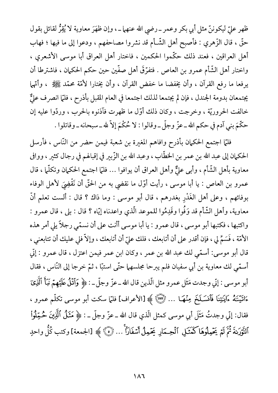 فلمّا اجتمع الحكمان بأذرح وافاهم المغيرة بن شعبة فيمن حضر من النّاس، فأرسل الحكمان إلى عبد الله بن عمر بن الخطّاب، وعبد الله بن الزّبير في إقبالهم في رجال كثير، ووافى معاوية بأهل الشّأم، وأبى عليٌّ وأهل العراق أن يوافوا ... فلمّا اجتمع الحكمان وتكلّما، قال عمرو بن العاص: يا أبا موسى، رأيت أوّل ما نقضي به من الحقّ أن نَقْضِيَ لأهل الوفاء بوفائهم، وعلى أهل الغَدْرِ بغدرهم، قال أبو موسى: وما ذاك؟ قال: ألست تعلم أنّ معاوية، وأهل الشّأم قد وَفُوا وقَدِمُوا للموعد الّذي واعدناه إيّاه؟ قال: بلى، قال عمرو: واكتبها، فكتبها أبو موسى، قال عمرو: يا أبا موسى أأنت على أن نسمّي رجلاً يلي أمر هذه الأمّة، فَسَمِّ لي، فإن أقدر على أن أتابعك، فلك عليّ أن أتابعك، وإلاّ فلي عليك أن تتابعني، قال أبو موسى: أسمّي لك عبد الله بن عمر، وكان ابن عمر فيمن اعتزل، قال عمرو: إنّي أسمّي لك معاوية بن أبي سفيان فلم يبرحا مجلسهما حتّى استبّا، ثمّ خرجا إلى النّاس، فقال أبو موسى: إنّي وجدت مَثَل عمرو مثل الّذين قال الله ـ عزّ وجلّ ـ: {وَاتْلُ عَلَيْهِمْ نَبَأَ الَّذِي آتَيْنَاهُ آيَاتِنَا فَانْسَلَخَ مِنْهَا ... (١٧٥)} [الأعراف] فلمّا سكت أبو موسى تكلّم عمرو، فقال: إنّي وجدتُ مَثَلَ أبي موسى كمثل الّذي قال الله ـ عزّ وجلّ ـ: {مَثَلُ الَّذِينَ حُمِّلُوا التَّوْرَاةَ ثُمَّ لَمْ يَحْمِلُوهَا كَمَثَلِ الْحِمَارِ يَحْمِلُ أَسْفَارًا ... (٥)} [الجمعة] وكتب كُلُّ واحدٍ