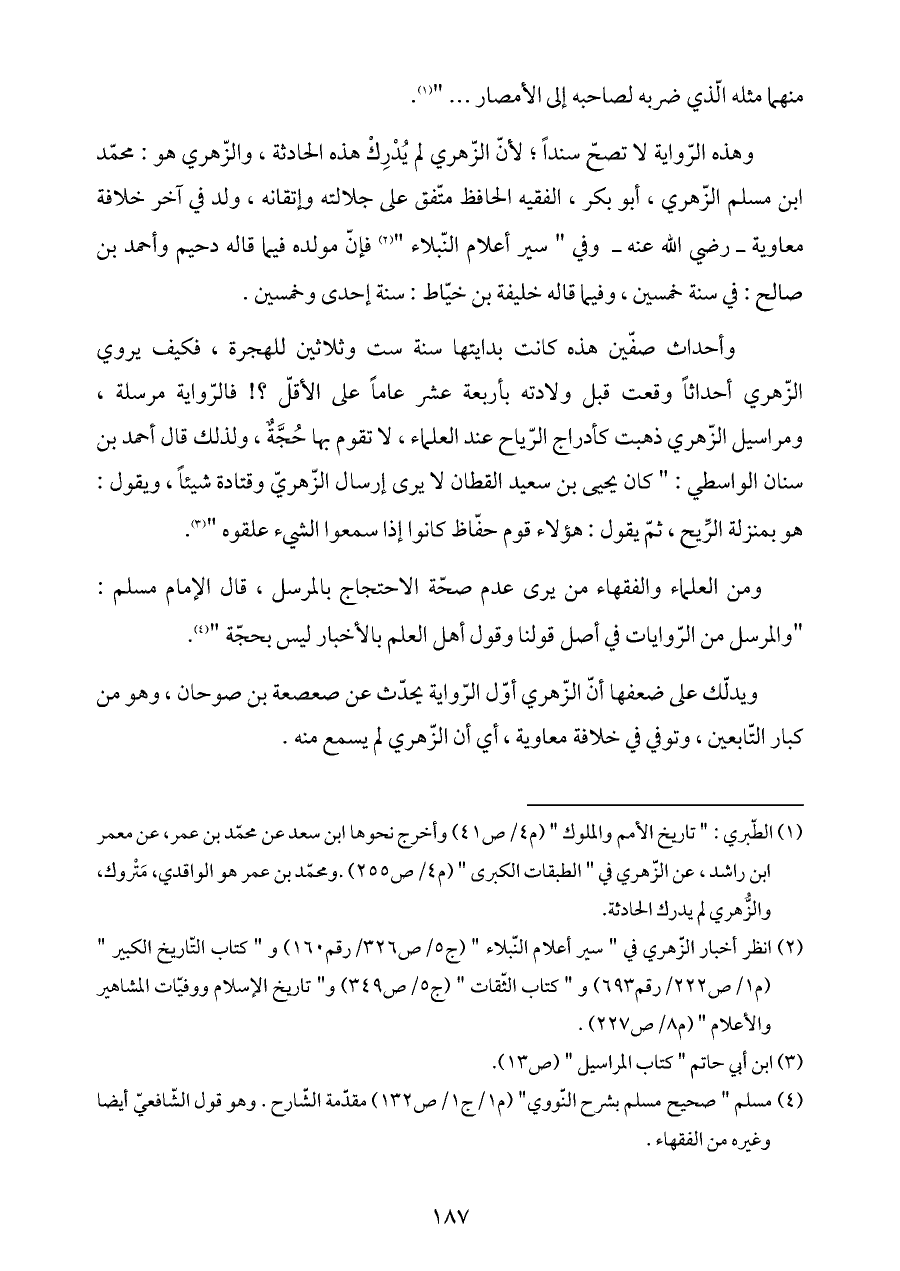 وأحداث صفّين هذه كانت بدايتها سنة ست وثلاثين للهجرة، فكيف يروي الزّهري أحداثاً وقعت قبل ولادته بأربعة عشر عاماً على الأقلّ؟! فالرّواية مرسلة، ... ومراسيل الزّهري ذهبت كأدراج الرّياح عند العلماء، لا تقوم بها حُجَّةٌ، ولذلك قال أحمد بن سنان الواسطي: " كان يحيى بن سعيد القطان لا يرى إرسال الزّهريّ وقتادة شيئاً، ويقول: هو بمنزلة الرِّيح، ثمّ يقول: هؤلاء قوم حفّاظ كانوا إذا سمعوا الشيء علقوه " (¬٣).