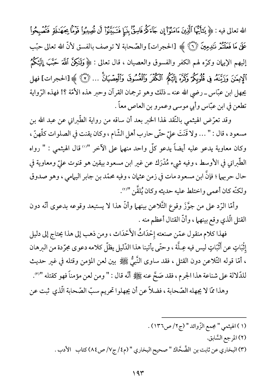فهذا كلام منقول عمّن صنعته إِحْدَاثُ الأَحْدَاث، ومن ذهب إلى هذا يحتاج إلى دليل إِثْبَاتٍ عن أَثْبَاتٍ ليس فيه عِلَّة، وحتّى يأتينا هذا الدّليل يظلّ كلامه دعوى مجرّدة من البرهان، أمّا قوله التّلاعن دون القتل، فقد ساوى النَّبيُّ - صلى الله عليه وسلم - بين لعن المؤمن وقتله في غير حديث للدّلالة على شناعة هذا الجرم، فقد صَحَّ عنه - صلى الله عليه وسلم - أنّه قال: " ومن لعن مؤمناً فهو كقتله " (¬٣).