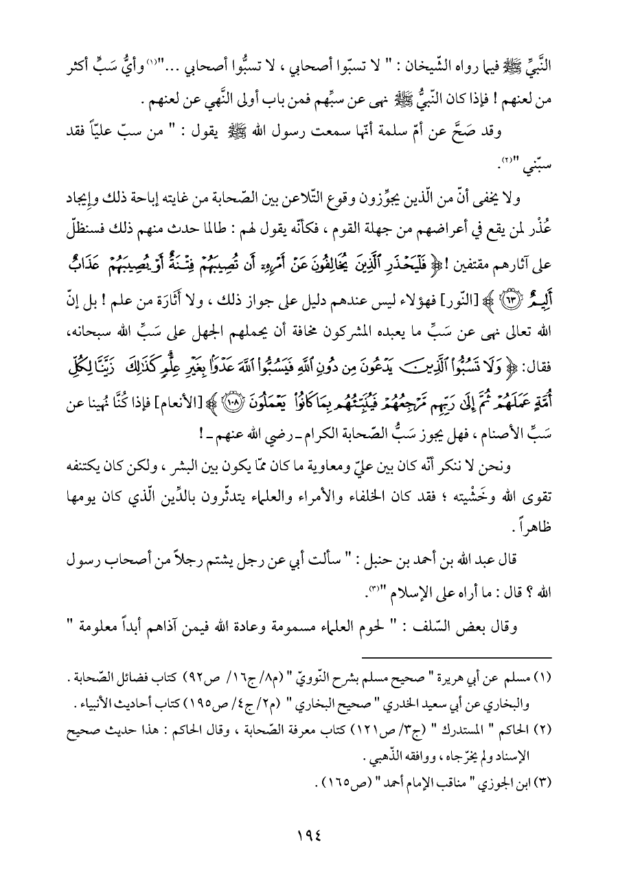ولا يخفى أنّ من الّذين يجوِّزون وقوع التّلاعن بين الصّحابة من غايته إباحة ذلك وإِيجاد عُذْر لمن يقع في أعراضهم من جهلة القوم، فكأنّه يقول لهم: طالما حدث منهم ذلك فسنظلّ على آثارهم مقتفين! {فَلْيَحْذَرِ الَّذِينَ يُخَالِفُونَ عَنْ أَمْرِهِ أَنْ تُصِيبَهُمْ فِتْنَةٌ أَوْ يُصِيبَهُمْ عَذَابٌ أَلِيمٌ (٦٣)} [النّور] فهؤلاء ليس عندهم دليل على جواز ذلك، ولا أَثَارَة من علم! بل إنّ الله تعالى نهى عن سَبِّ ما يعبده المشركون مخافة أن يحملهم الجهل على سَبِّ الله سبحانه، فقال: {وَلَا تَسُبُّوا الَّذِينَ يَدْعُونَ مِنْ دُونِ اللَّهِ فَيَسُبُّوا اللَّهَ عَدْوًا بِغَيْرِ عِلْمٍ كَذَلِكَ زَيَّنَّا لِكُلِّ أُمَّةٍ عَمَلَهُمْ ثُمَّ إِلَى رَبِّهِمْ مَرْجِعُهُمْ فَيُنَبِّئُهُمْ بِمَا كَانُوا يَعْمَلُونَ (١٠٨)} [الأنعام] فإذا كُنَّا نُهينا عن سَبِّ الأصنام، فهل يجوز سَبُّ الصّحابة الكرام ـ رضي الله عنهم ـ!