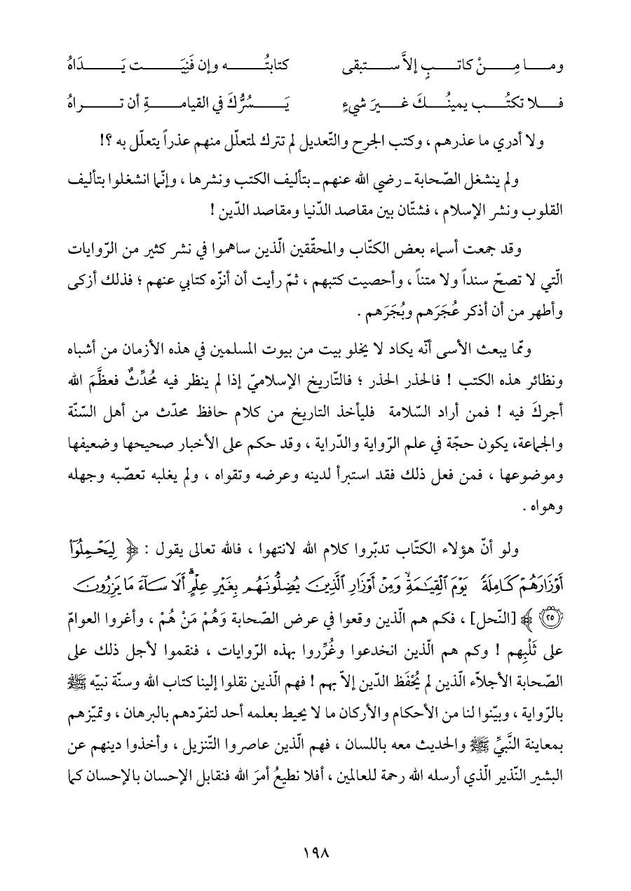 ومّما يبعث الأسى أنّه يكاد لا يخلو بيت من بيوت المسلمين في هذه الأزمان من أشباه ونظائر هذه الكتب! فالحذر الحذر؛ فالتّاريخ الإسلاميّ إذا لم ينظر فيه مُحدِّثٌ فعظَّمَ الله أجركَ فيه! فمن أراد السّلامة فليأخذ التاريخ من كلام حافظ محدّث من أهل السّنّة والجماعة، يكون حجّة في علم الرّواية والدّراية، وقد حكم على الأخبار صحيحها وضعيفها وموضوعها، فمن فعل ذلك فقد استبرأ لدينه وعرضه وتقواه، ولم يغلبه تعصّبه وجهله وهواه.