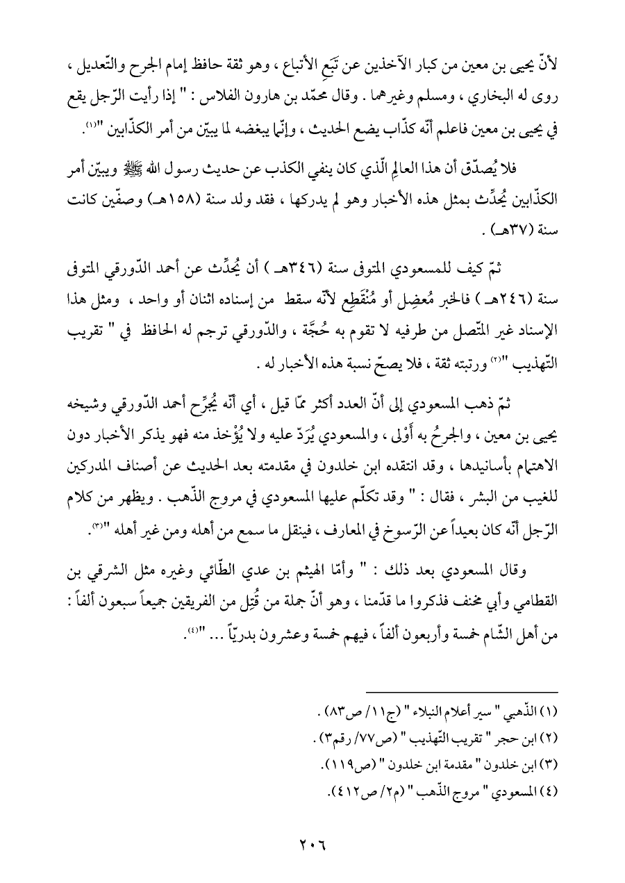 ثمّ ذهب المسعودي إلى أنّ العدد أكثر ممّا قيل، أي أنّه يُجرِّح أحمد الدّورقي وشيخه يحيى بن معين، والجرحُ به أَوْلى، والمسعودي يُرَدّ عليه ولا يُؤْخذ منه فهو يذكر الأخبار دون الاهتمام بأسانيدها، وقد انتقده ابن خلدون في مقدمته بعد الحديث عن أصناف المدركين للغيب من البشر، فقال: " وقد تكلّم عليها المسعودي في مروج الذّهب. ويظهر من كلام الرّجل أنّه كان بعيداً عن الرّسوخ في المعارف، فينقل ما سمع من أهله ومن غير أهله " (¬٣).