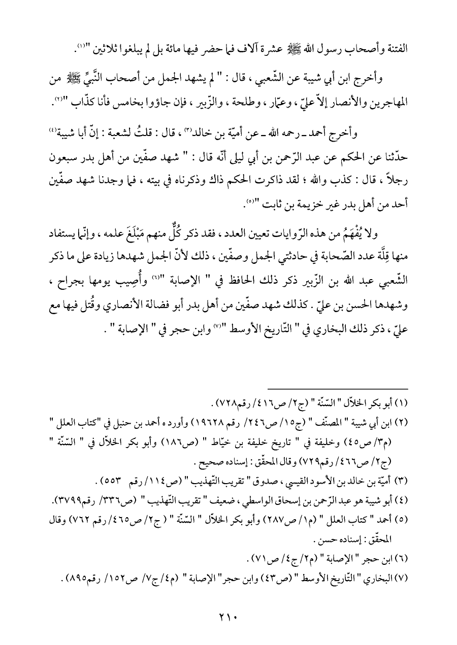 ولا يُفْهَمُ من هذه الرّوايات تعيين العدد، فقد ذكر كُلٌّ منهم مَبْلَغَ علمه، وإنّما يستفاد منها قِلَّة عدد الصّحابة في حادثتي الجمل وصفّين، ذلك لأنّ الجمل شهدها زيادة على ما ذكر الشّعبي عبد الله بن الزّبير ذكر ذلك الحافظ في " الإصابة " (¬٦) وأُصِيب يومها بجراح، وشهدها الحسن بن عليّ. كذلك شهد صفّين من أهل بدر أبو فضالة الأنصاري وقُتل فيها مع عليّ، ذكر ذلك البخاري في " التّاريخ الأوسط " (¬٧) وابن حجر في " الإصابة ".