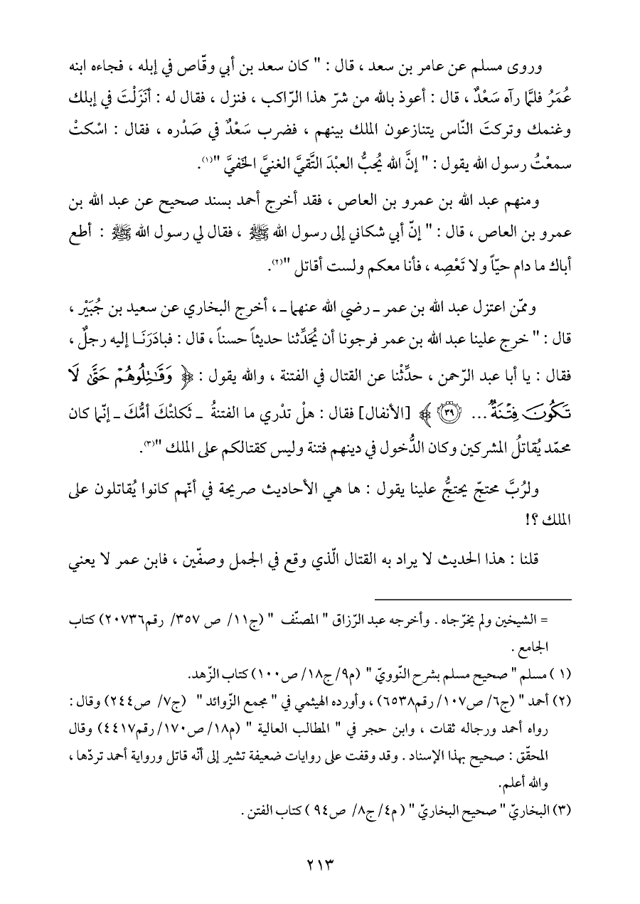 وممّن اعتزل عبد الله بن عمر ـ رضي الله عنهما ـ، أخرج البخاري عن سعيد بن جُبَيْر، قال: " خرج علينا عبد الله بن عمر فرجونا أن يُحَدِّثنا حديثاً حسناً، قال: فبادَرَنَا إليه رجلٌ، فقال: يا أبا عبد الرّحمن، حدِّثْنا عن القتال في الفتنة، والله يقول: {وَقَاتِلُوهُمْ حَتَّى لَا تَكُونَ فِتْنَةٌ ... (٣٩)} [الأنفال] فقال: هلْ تدْري ما الفتنةُ ـ ثَكلتْكَ أمُّكَ ـ إنّما كان محمّد يُقاتلُ المشركين وكان الدُّخول في دينهم فتنة وليس كقتالكم على الملك " (¬٣).