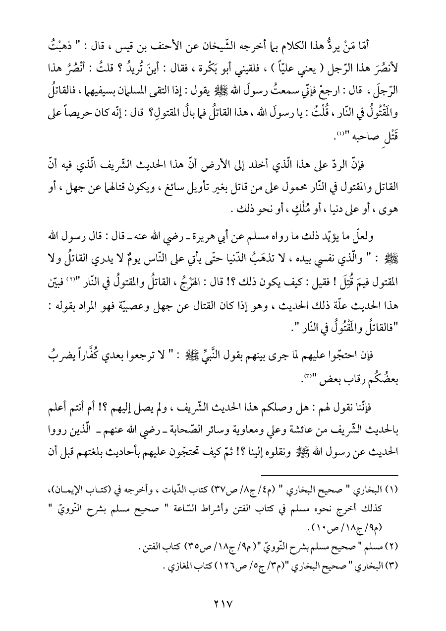 أمّا مَنْ يردُّ هذا الكلام بما أخرجه الشّيخان عن الأحنف بن قيس، قال: " ذهبْتُ لأنصُرَ هذا الرّجل (يعني عليّاً)، فلقيني أبو بَكْرة، فقال: أينَ تُريدُ؟ قلتُ: أنْصُرُ هذا الرّجلَ، قال: ارجعْ فإنّي سمعتُ رسولَ الله - صلى الله عليه وسلم - يقول: إذا التقى المسلمان بسيفيهما، فالقاتلُ والمَقْتُولُ في النّار، قُلْتُ: يا رسولَ الله، هذا القاتلُ فما بالُ المقتولِ؟ قال: إنّه كان حريصاً على قَتْلِ صاحبه " (¬١).