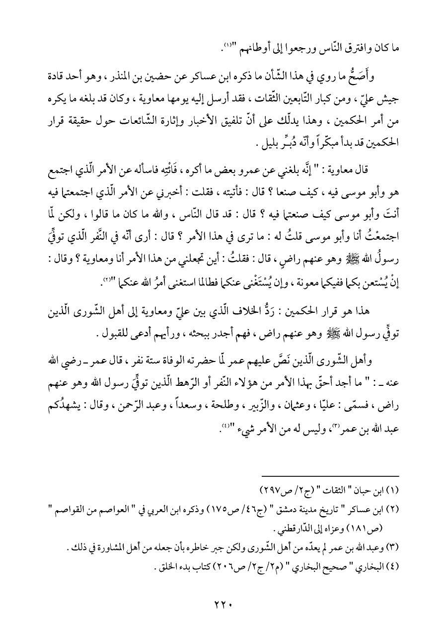 هذا هو قرار الحكمين: رَدُّ الخلاف الّذي بين عليّ ومعاوية إلى أهل الشّورى الّذين توفِّي رسول الله - صلى الله عليه وسلم - وهو عنهم راض، فهم أجدر ببحثه، ورأيهم أدعى للقبول.