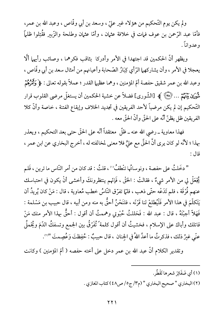 ولم يكن يوم التّحكيم من هؤلاء غير عليّ، وسعد بن أبي وقّاص، وعبد الله بن عمر، فأمّا عبد الرّحمن بن عوف فمات في خلافة عثمان، وأمّا عثمان وطلحة والزّبير فقُتِلوا ظلماً وعدواناً.