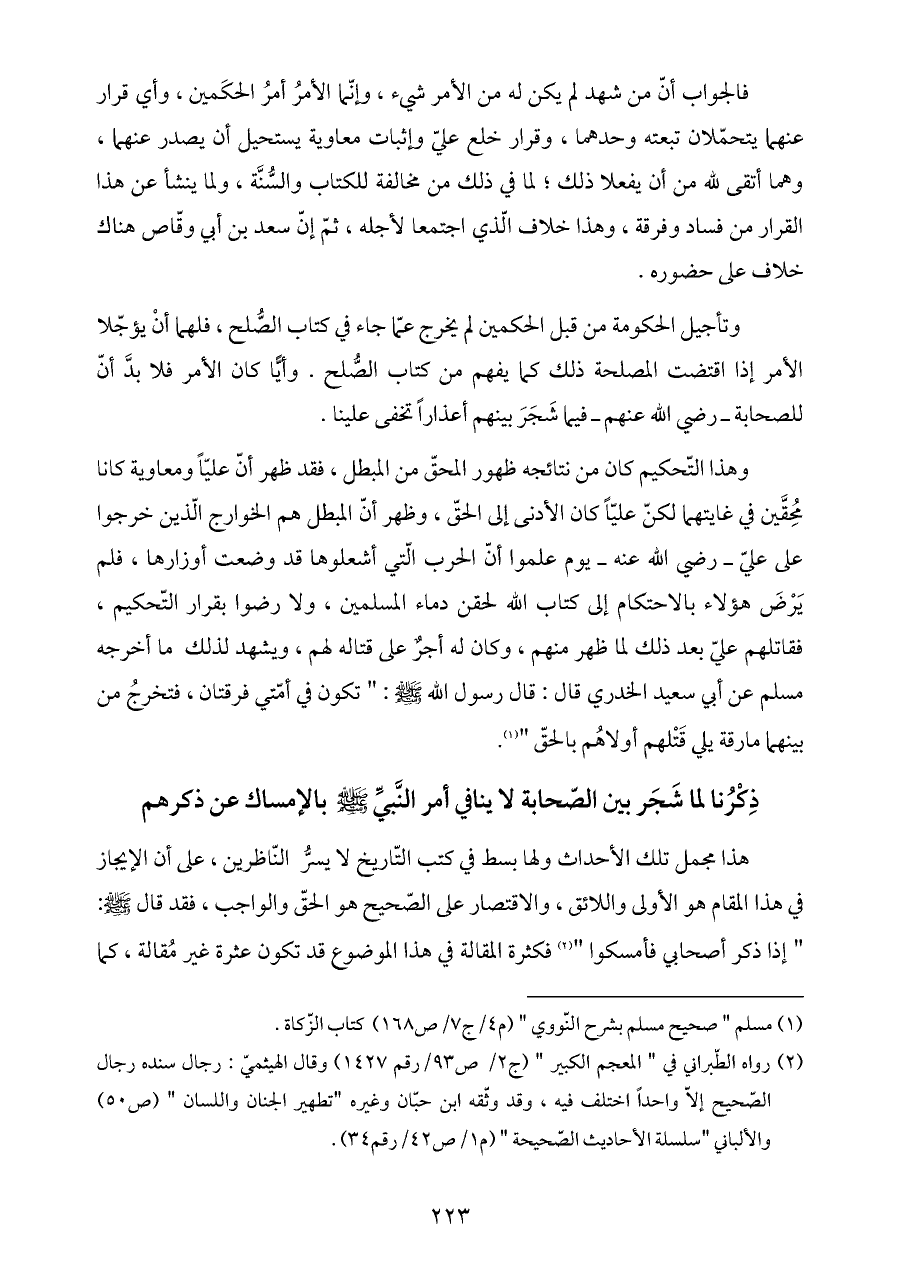 هذا مجمل تلك الأحداث ولها بسط في كتب التّاريخ لا يسرُّ النّاظرين، على أن الإيجاز في هذا المقام هو الأولى واللائق، والاقتصار على الصّحيح هو الحقّ والواجب، فقد قال - صلى الله عليه وسلم -: " إذا ذكر أصحابي فأمسكوا " (¬٢) فكثرة المقالة في هذا الموضوع قد تكون عثرة غير مُقالة، كما
