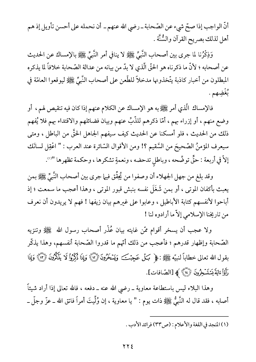 وَذِكْرُنا لما جرى بين أصحاب النَّبيِّ - صلى الله عليه وسلم - لا ينافي أمر النَّبيِّ - صلى الله عليه وسلم - بالإمساك عن الحديث عن أصحابه؛ لأنّ ما ذكرناه هو الحقّ الّذي لا بدّ من بيانه من عدالة الصّحابة خلافاً لما يذكره المبطلون من أخبار كاذبة يتّخذونها مدخلاً للطّعن على أصحاب النَّبيِّ - صلى الله عليه وسلم - ليوقعوا العامّة في بُغْضِهم.
