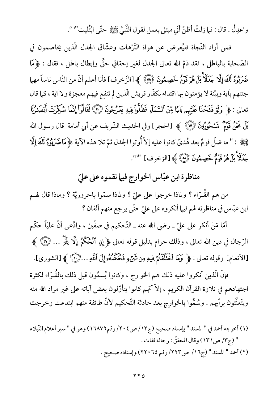 فمن أراد النّجاة فليُعرض عن هواة التّرّهات وعشّاق الجدل الّذين يخاصمون في الصّحابة بالباطل، فقد ذمّ الله تعالى الجدل لغير إحقاقِ حقٍّ وإبطال باطل، فقال: {مَا ضَرَبُوهُ لَكَ إِلَّا جَدَلًا بَلْ هُمْ قَوْمٌ خَصِمُونَ (٥٨)} [الزّخرف] فأنا أعلم أنّ من النّاس ناساً مهما جئتهم بآية وبيّنة لا يؤمنون بها اقتداء بكفّار قريش الّذين لم تنفع فيهم معجزة ولا آية، كما قال تعالى: {وَلَوْ فَتَحْنَا عَلَيْهِمْ بَابًا مِنَ السَّمَاءِ فَظَلُّوا فِيهِ يَعْرُجُونَ (١٤) لَقَالُوا إِنَّمَا سُكِّرَتْ أَبْصَارُنَا بَلْ نَحْنُ قَوْمٌ مَسْحُورُونَ (١٥)} [الحجر] وفي الحديث الشّريف عن أبي أمامة قال رسول الله - صلى الله عليه وسلم -: " ما ضلّ قومٌ بعد هُدىً كانوا عليه إلاّ أُوتوا الجدل ثمّ تلا هذه الآية {مَا ضَرَبُوهُ لَكَ إِلَّا جَدَلًا بَلْ هُمْ قَوْمٌ خَصِمُونَ (٥٨)} [الزخرف] " (¬٢).