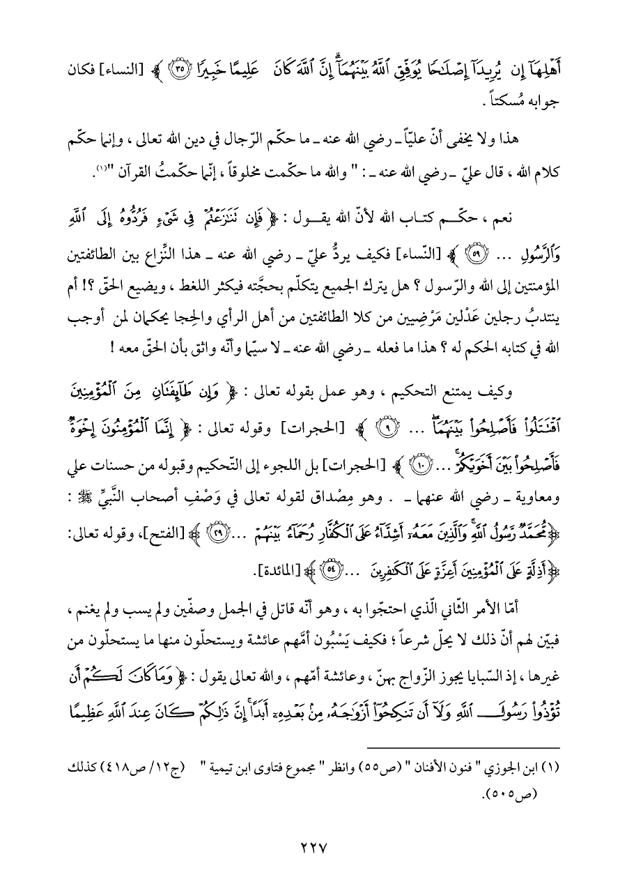 وكيف يمتنع التحكيم، وهو عمل بقوله تعالى: {وَإِنْ طَائِفَتَانِ مِنَ الْمُؤْمِنِينَ اقْتَتَلُوا فَأَصْلِحُوا بَيْنَهُمَا ... (٩)} [الحجرات] وقوله تعالى: {إِنَّمَا الْمُؤْمِنُونَ إِخْوَةٌ فَأَصْلِحُوا بَيْنَ أَخَوَيْكُمْ ... (١٠)} [الحجرات] بل اللجوء إلى التّحكيم وقبوله من حسنات علي ومعاوية ـ رضي الله عنهما ـ. وهو مِصْداق لقوله تعالى في وَصْفِ أصحاب النَّبيِّ - صلى الله عليه وسلم -: {مُحَمَّدٌ رَسُولُ اللَّهِ وَالَّذِينَ مَعَهُ أَشِدَّاءُ عَلَى الْكُفَّارِ رُحَمَاءُ بَيْنَهُمْ ... (٢٩)} [الفتح]، وقوله تعالى: {أَذِلَّةٍ عَلَى الْمُؤْمِنِينَ أَعِزَّةٍ عَلَى الْكَافِرِينَ ... (٥٤)} [المائدة].