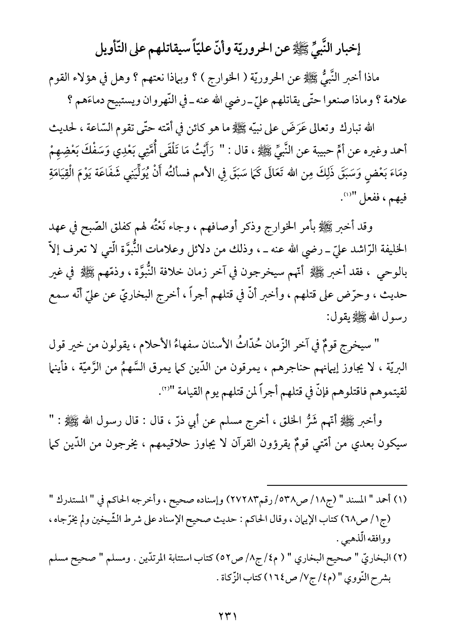 إخبار النَّبيِّ - صلى الله عليه وسلم - عن الحروريّة وأنّ عليّاً سيقاتلهم على التّأويل