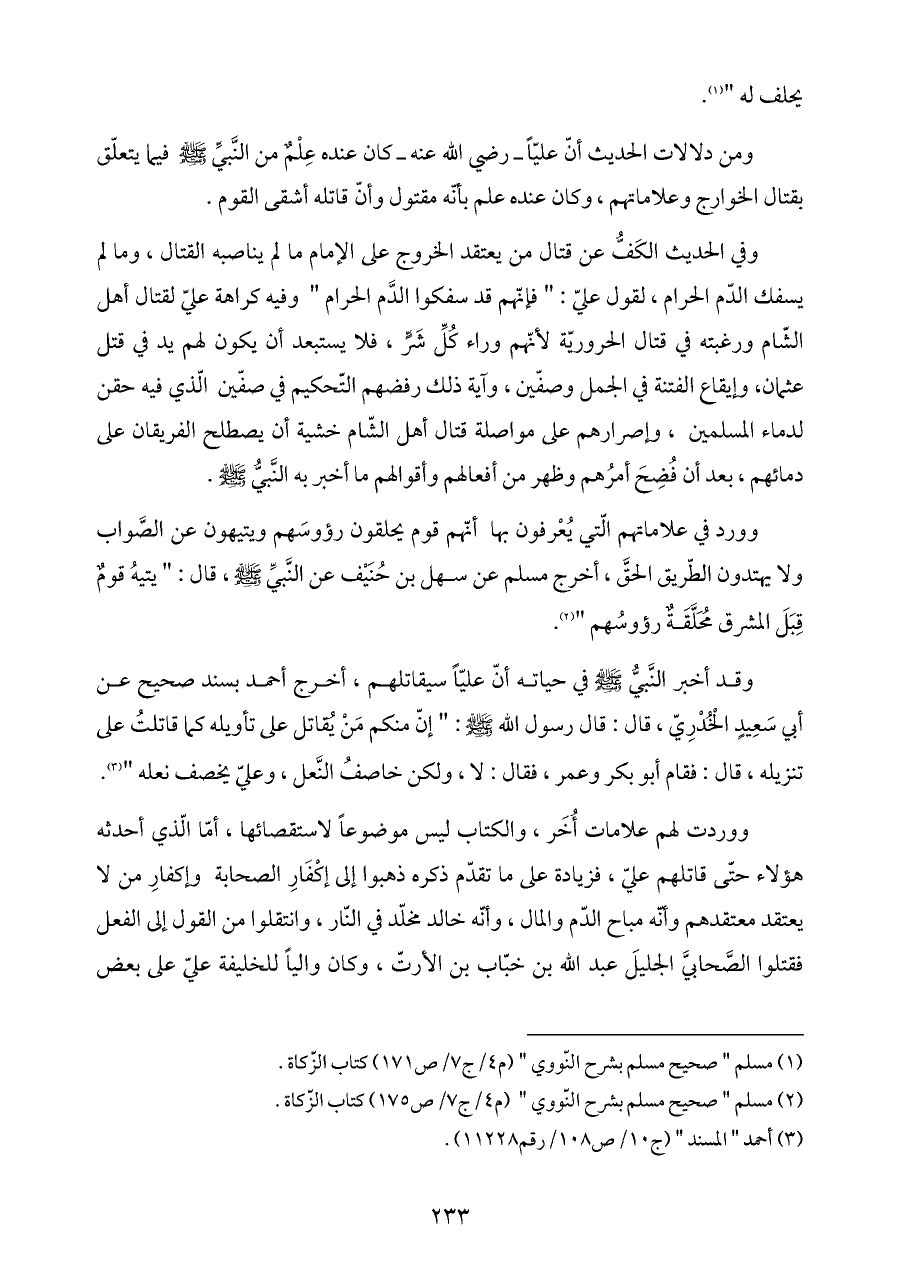وقد أخبر النَّبيُّ - صلى الله عليه وسلم - في حياته أنّ عليّاً سيقاتلهم، أخرج أحمد بسند صحيح عن أبي سَعِيدٍ الْخُدْرِيّ، قال: قال رسول الله - صلى الله عليه وسلم -: " إنّ منكم مَنْ يُقاتل على تأويله كما قاتلتُ على تنزيله، قال: فقام أبو بكر وعمر، فقال: لا، ولكن خاصفُ النَّعل، وعليّ يخصف نعله " (¬٣).