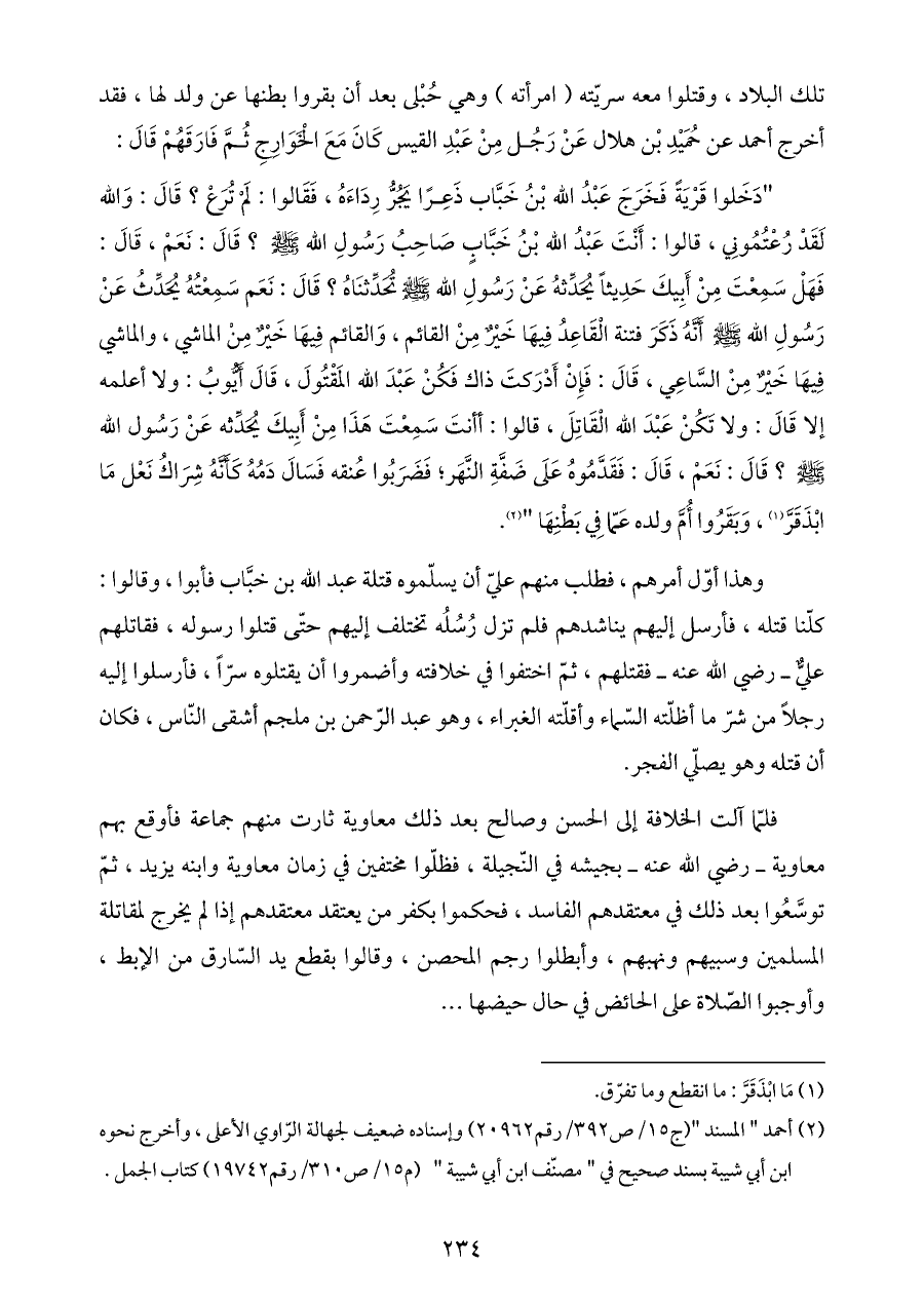 تلك البلاد، وقتلوا معه سريّته (امرأته) وهي حُبْلى بعد أن بقروا بطنها عن ولد لها، فقد أخرج أحمد عن حُمَيْدِ بْن هلال عَنْ رَجُل مِنْ عَبْدِ القيس كَانَ مَعَ الْخَوَارِجِ ثُمَّ فَارَقَهُمْ قَالَ: