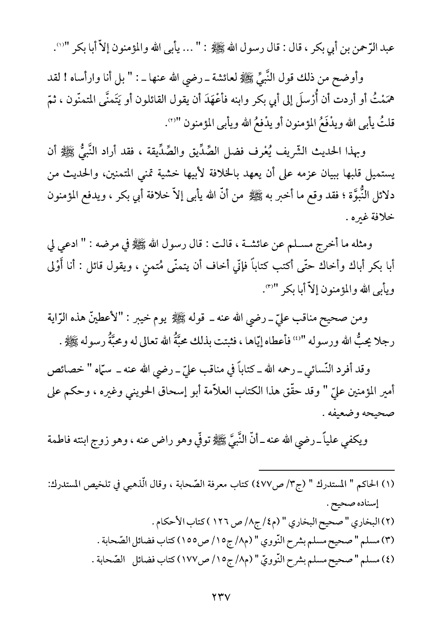 ومثله ما أخرج مسلم عن عائشة، قالت: قال رسول الله - صلى الله عليه وسلم - في مرضه: " ادعي لي أبا بكر أباك وأخاك حتّى أكتب كتاباً فإنّي أخاف أن يتمنّى مُتمنٍ، ويقول قائل: أنا أَوْلى ويأبى الله والمؤمنون إلاّ أبا بكر " (¬٣).