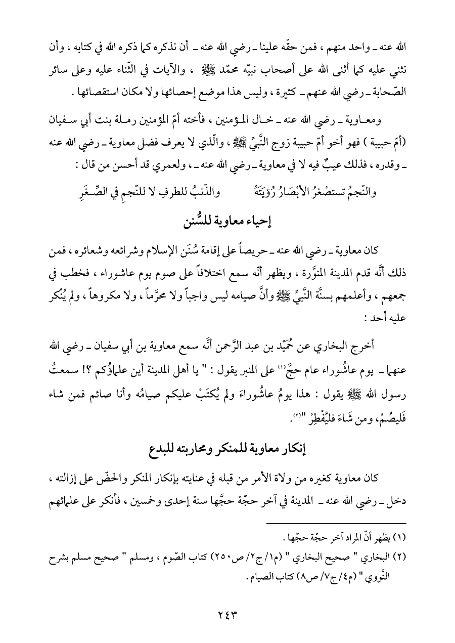 كان معاوية ـ رضي الله عنه ـ حريصاً على إقامة سُنَن الإسلام وشرائعه وشعائره، فمن ذلك أنَّه قدم المدينة المنوَّرة، ويظهر أنّه سمع اختلافاً على صوم يوم عاشوراء، فخطب في جمعهم، وأعلمهم بسنَّة النَّبيِّ - صلى الله عليه وسلم - وأنَّ صيامه ليس واجباً ولا محرَّماً، ولا مكروهاً، ولم يُنْكر عليه أحد: