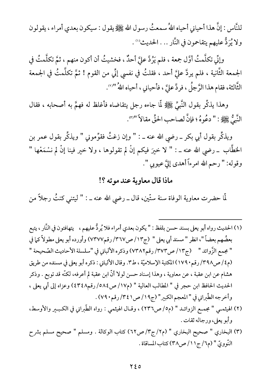 (¬١) الحديث رواه أبو يعلى بسند حسن بلفظ: " يكون بعدي أمراء فلا يُردُّ عليهم، ... يتهافتون في النَّار، يتبع بعضُهم بعضاً "، انظر " مسند أبي يعلى " (ج ١٣/ص ٣٦٧/رقم ٧٣٧٧) وأورده أبو يعلى مطولاً كما في " مجمع الزَّوائد " ... (ج ١٣/ص ٣٧٣/رقم ٧٣٨٢) وذكره الألباني في "سلسلة الأحاديث الصّحيحة " ... (م ٤/ص ٣٩٨/رقم ١٧٩٠) المكتبة الإسلاميّة، ط ٣. وقال الألباني: ذكره أبو يعلى في مسنده من طريق هشام عن ابن عقبة، عن معاوية، وهذا إسناد حسن لولا أنّ ابن عقبة لم أعرفه، لكنّه قد توبع .. وذكر الحديث الحافظ ابن حجر في " المطالب العالية " (م ١٧/ص ٥٨٤/رقم ٤٣٤٨) وعزاه إلى أبي يعلى، وأخرجه الطّبراني في " المعجم الكبير" (ج ١٩/ص ٣٤١/رقم ٧٩٠).