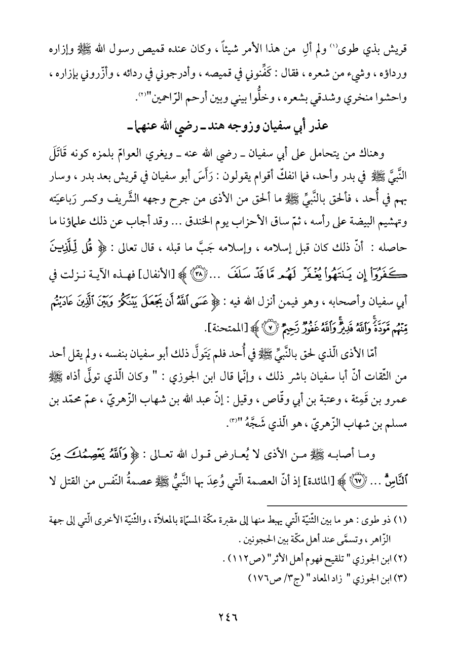 أمّا الأذى الّذي لحق بالنَّبيِّ - صلى الله عليه وسلم - في أُحد فلم يَتَولَّ ذلك أبو سفيان بنفسه، ولم يقل أحد من الثّقات أنّ أبا سفيان باشر ذلك، وإنّما قال ابن الجوزي: " وكان الّذي تولَّى أذاه - صلى الله عليه وسلم - عمرو بن قَمِئة، وعتبة بن أبي وقّاص، وقيل: إنّ عبد الله بن شهاب الزّهريّ، عمّ محمّد بن مسلم بن شهاب الزّهريّ، هو الّذي شَجَّهُ " (¬٣).