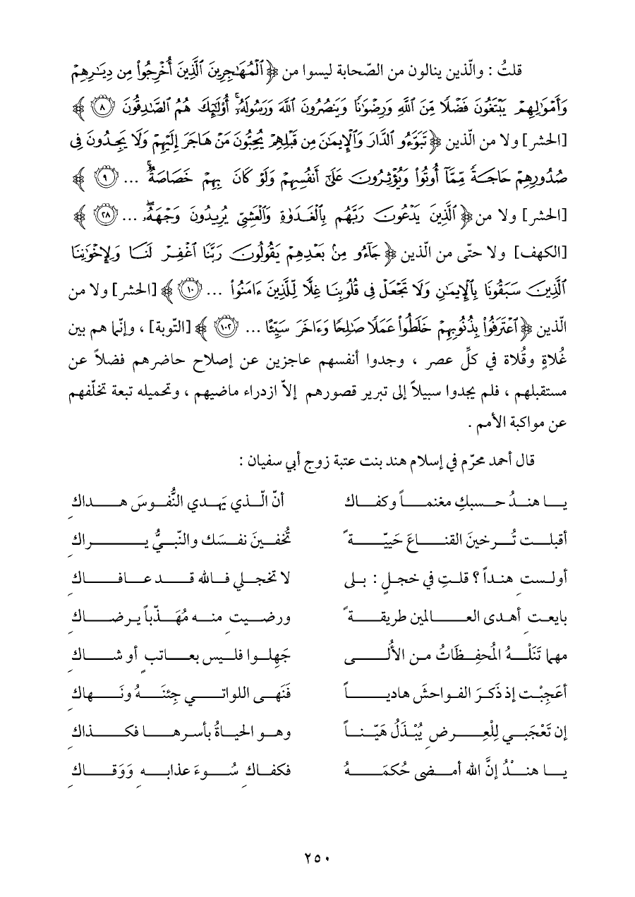 قلتُ: والّذين ينالون من الصّحابة ليسوا من {الْمُهَاجِرِينَ الَّذِينَ أُخْرِجُوا مِنْ دِيَارِهِمْ وَأَمْوَالِهِمْ يَبْتَغُونَ فَضْلًا مِنَ اللَّهِ وَرِضْوَانًا وَيَنْصُرُونَ اللَّهَ وَرَسُولَهُ أُولَئِكَ هُمُ الصَّادِقُونَ (٨)} [الحشر] ولا من الّذين {تَبَوَّءُوا الدَّارَ وَالْإِيمَانَ مِنْ قَبْلِهِمْ يُحِبُّونَ مَنْ هَاجَرَ إِلَيْهِمْ وَلَا يَجِدُونَ فِي صُدُورِهِمْ حَاجَةً مِمَّا أُوتُوا وَيُؤْثِرُونَ عَلَى أَنْفُسِهِمْ وَلَوْ كَانَ بِهِمْ خَصَاصَةٌ ... (٩)} [الحشر] ولا من {الَّذِينَ يَدْعُونَ رَبَّهُمْ بِالْغَدَاةِ وَالْعَشِيِّ يُرِيدُونَ وَجْهَهُ ... (٢٨)} [الكهف] ولا حتّى من الّذين {جَاءُوا مِنْ بَعْدِهِمْ يَقُولُونَ رَبَّنَا اغْفِرْ لَنَا وَلِإِخْوَانِنَا الَّذِينَ سَبَقُونَا بِالْإِيمَانِ وَلَا تَجْعَلْ فِي قُلُوبِنَا غِلًّا لِلَّذِينَ آمَنُوا ... (١٠)} [الحشر] ولا من الّذين {اعْتَرَفُوا بِذُنُوبِهِمْ خَلَطُوا عَمَلًا صَالِحًا وَآخَرَ سَيِّئًا ... (١٠٢)} [التّوبة]، وإنّما هم بين غُلاةٍ وقُلاة في كلِّ عصر، وجدوا أنفسهم عاجزين عن إصلاح حاضرهم فضلاً عن مستقبلهم، فلم يجدوا سبيلاً إلى تبرير قصورهم إلاّ ازدراء ماضيهم، وتحميله تبعة تخلّفهم عن مواكبة الأمم.