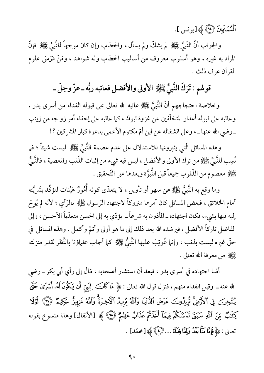 وهذه المسائل الّتي يثيرونها للاستدلال على عدم عصمة النَّبيِّ - صلى الله عليه وسلم - ليست شيئاً؛ فما نُسِب للنَّبيِّ - صلى الله عليه وسلم - من ترك الأولى والأفضل، ليس فيه شيء من إثبات الذّنب والمعصية، فالنَّبيُّ - صلى الله عليه وسلم - معصوم من الذّنوب جميعاً قبل النُّبوَّة وبعدها على التّحقيق.
